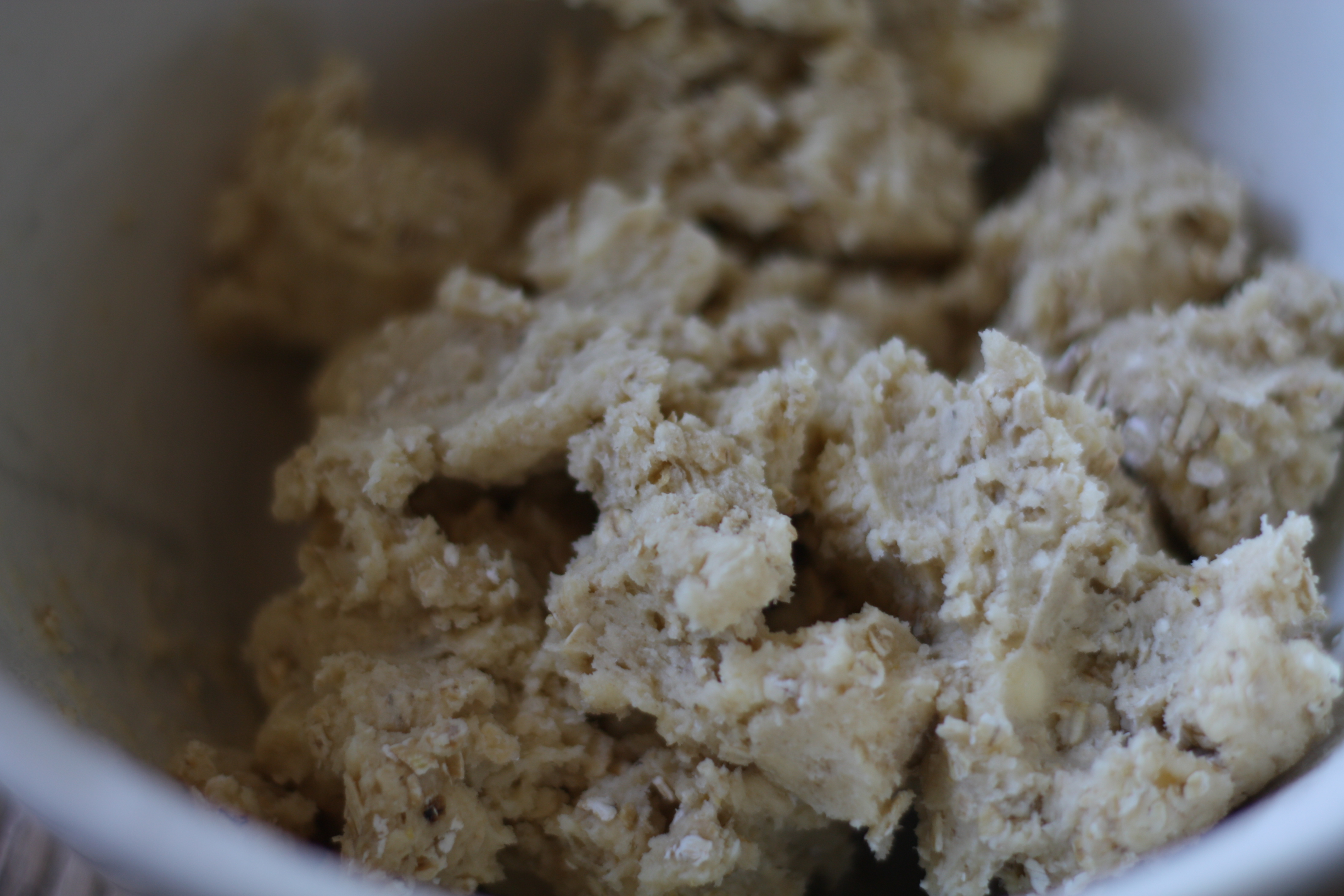 Tilsett kalde smørterninger, og smuldre sammen med hendene. Det skal bli store og småbiter.