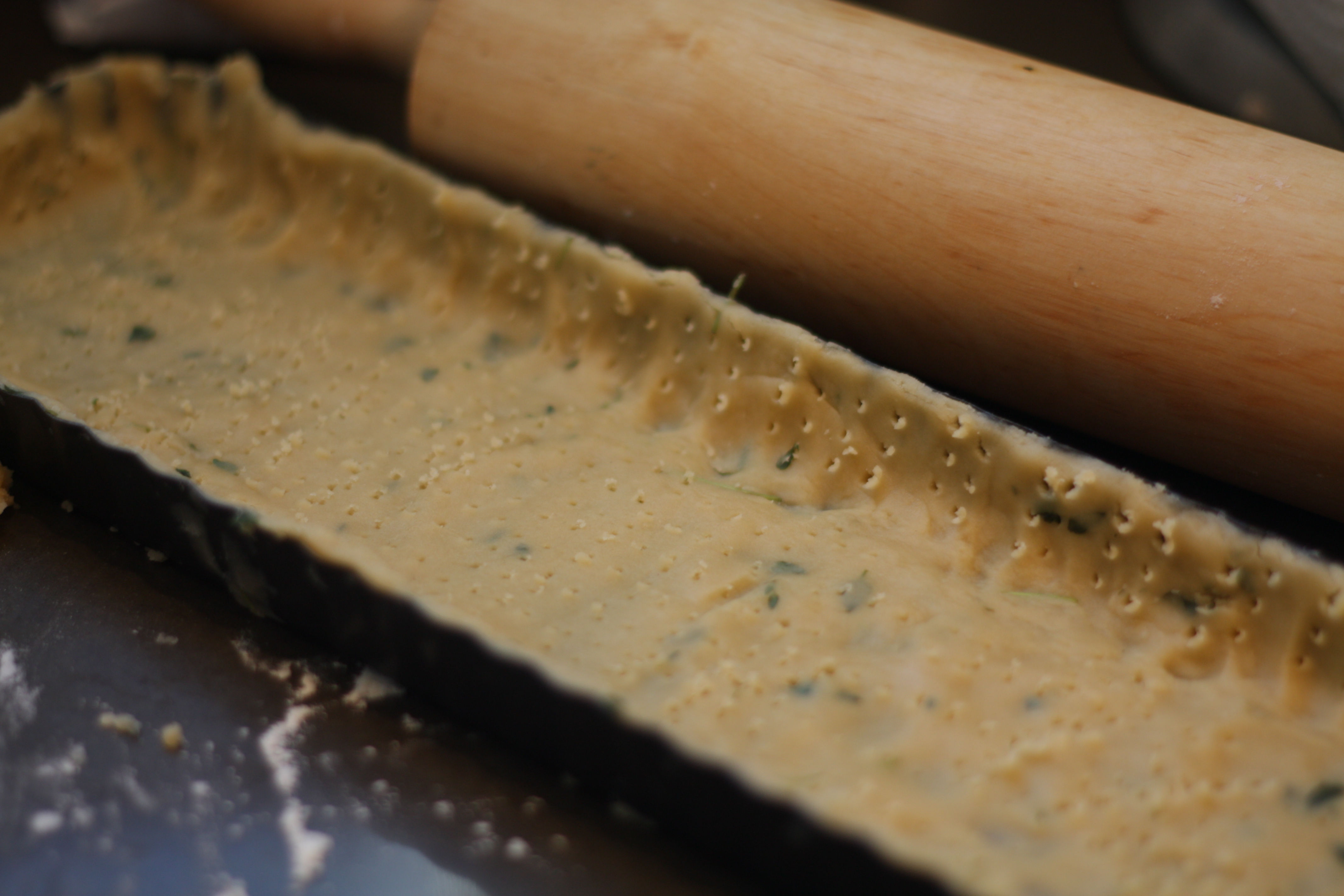 4. Kjevl, og trykk deigen ned i formen. Pass på å trykke så tynt som mulig. Prikk bunnen med en gaffel.