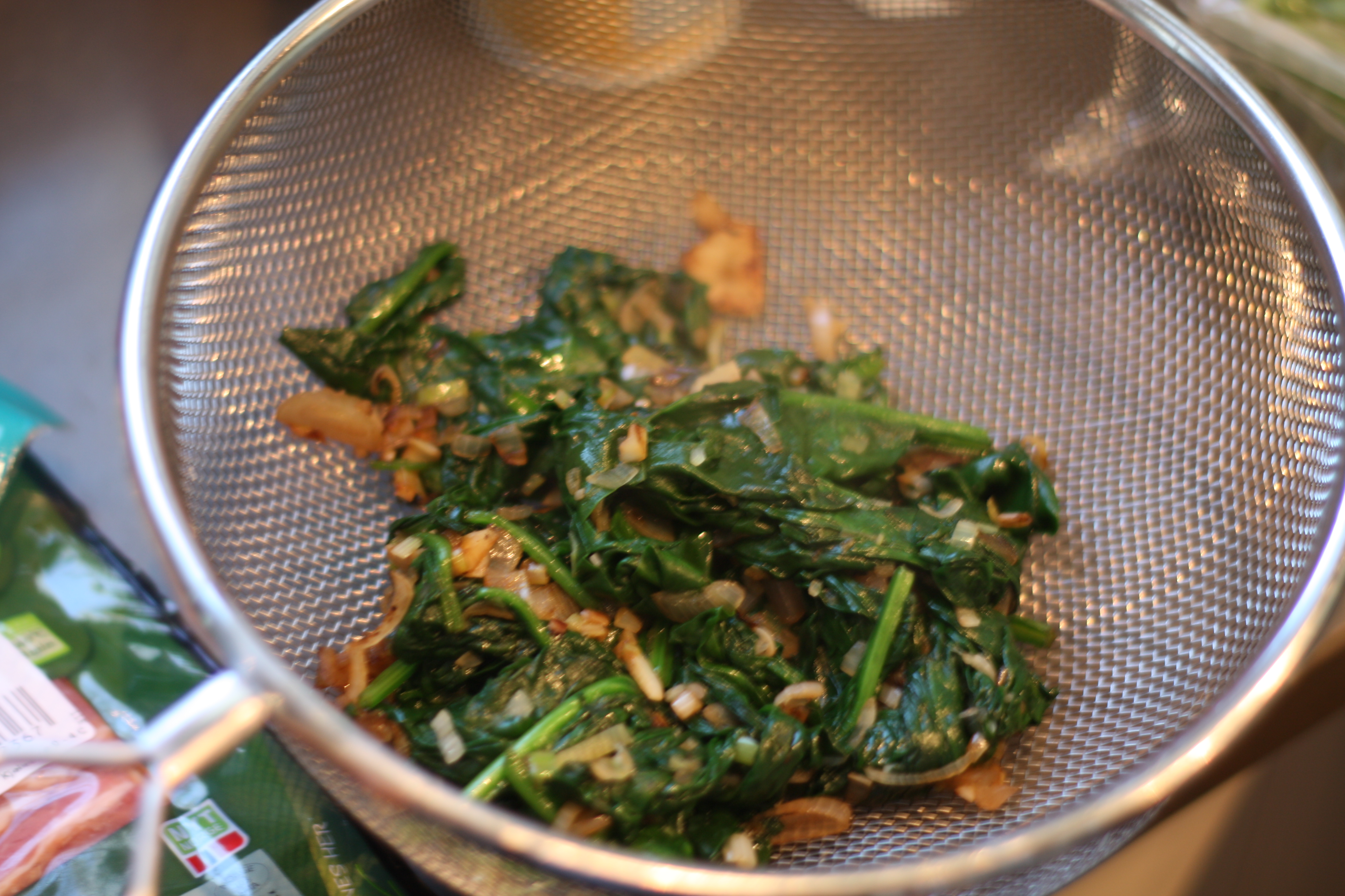 Ha den deretter i en sil, og press ut alt vannet. Jeg brukte en slikkepott, som jeg presset ut væsken med. Her er det viktig å ikke å slurve. Blir det for mye væske i spinaten, blir paiskallet vått.