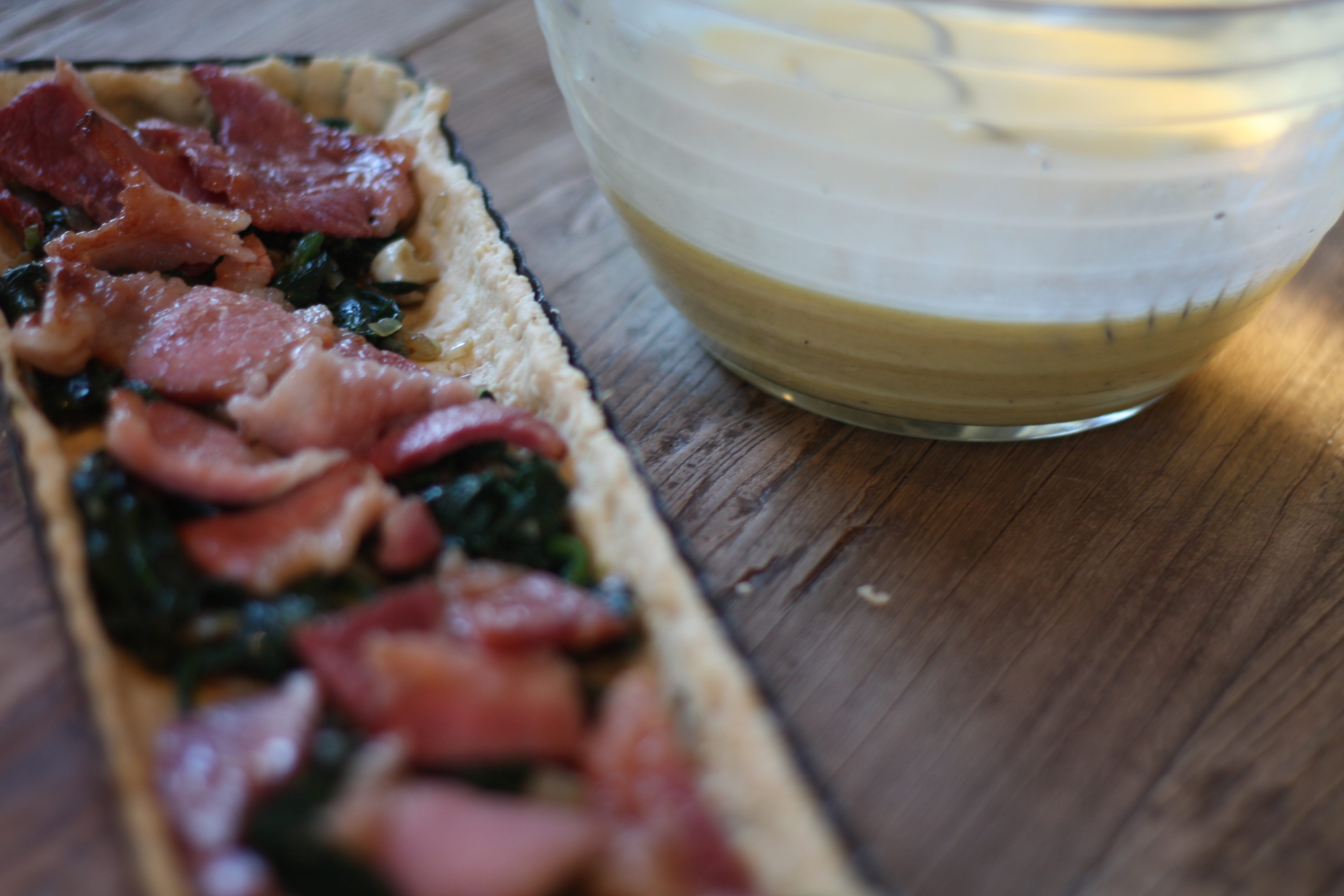 7. Fyll paiformen med bacon, spinat og løkblandigen.