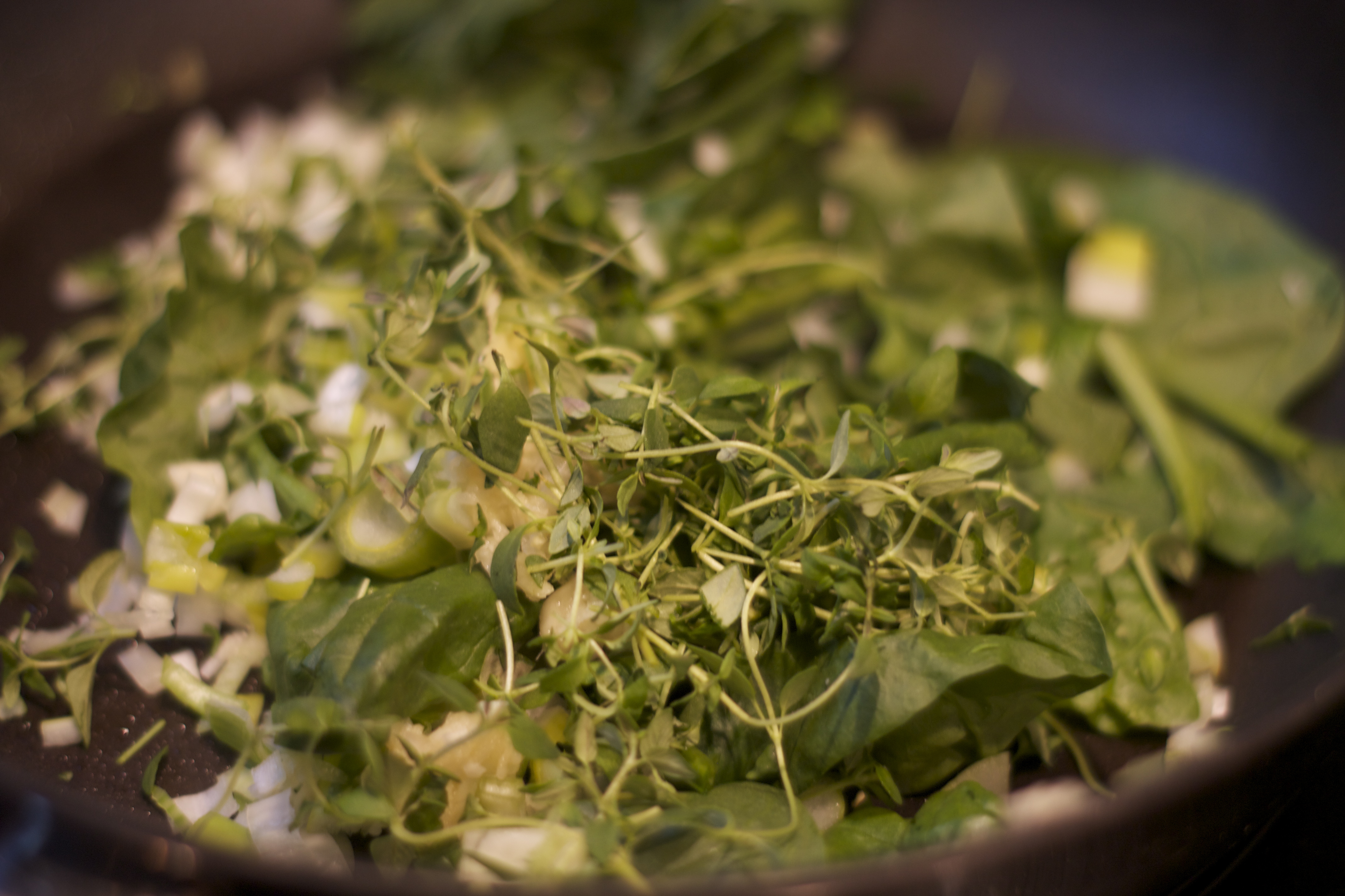 2. Surr vårløk, timian, hvitløkog spinat i en panne, sammen med litt olivenolje. Stek på lav varme til spinaten akkurat ikke faller sammen.