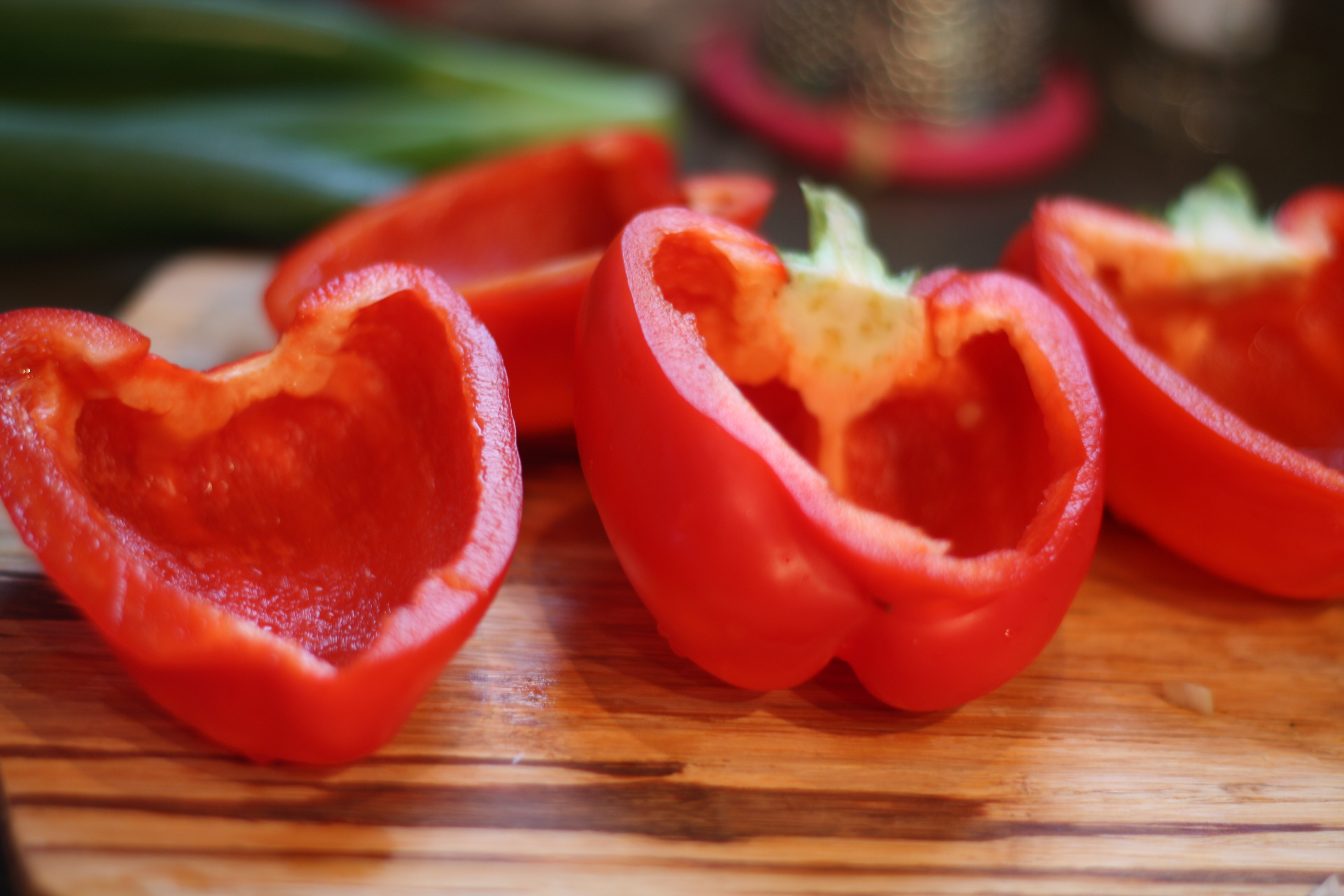 4. Skyll og skjær paprikane på langs. Rens ut alle frøene.