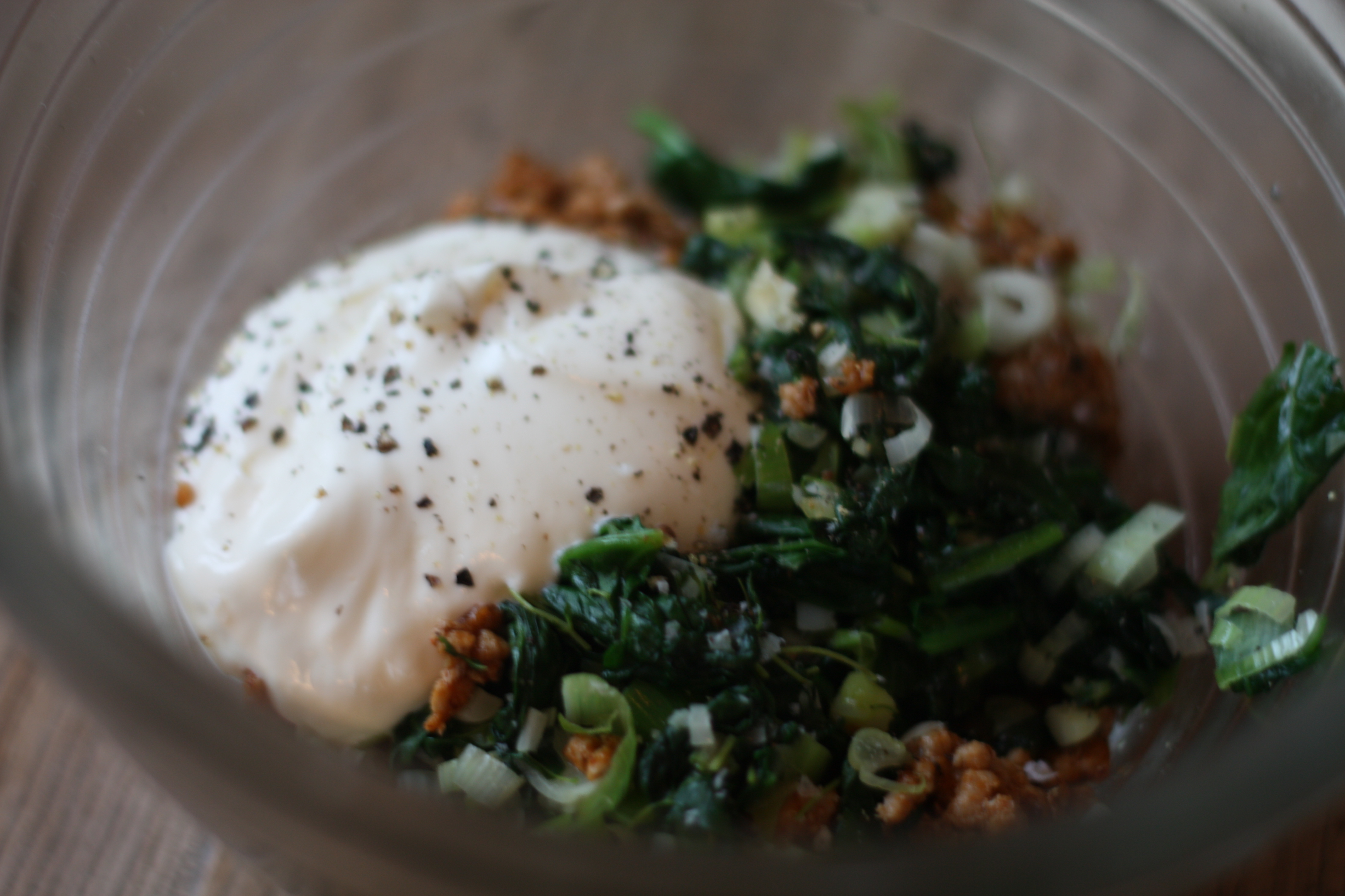 3. Bland alt godt, sammen med cream fraiche. Husk å presse ut vannet av spinaten før du tilsetter den i bollen.