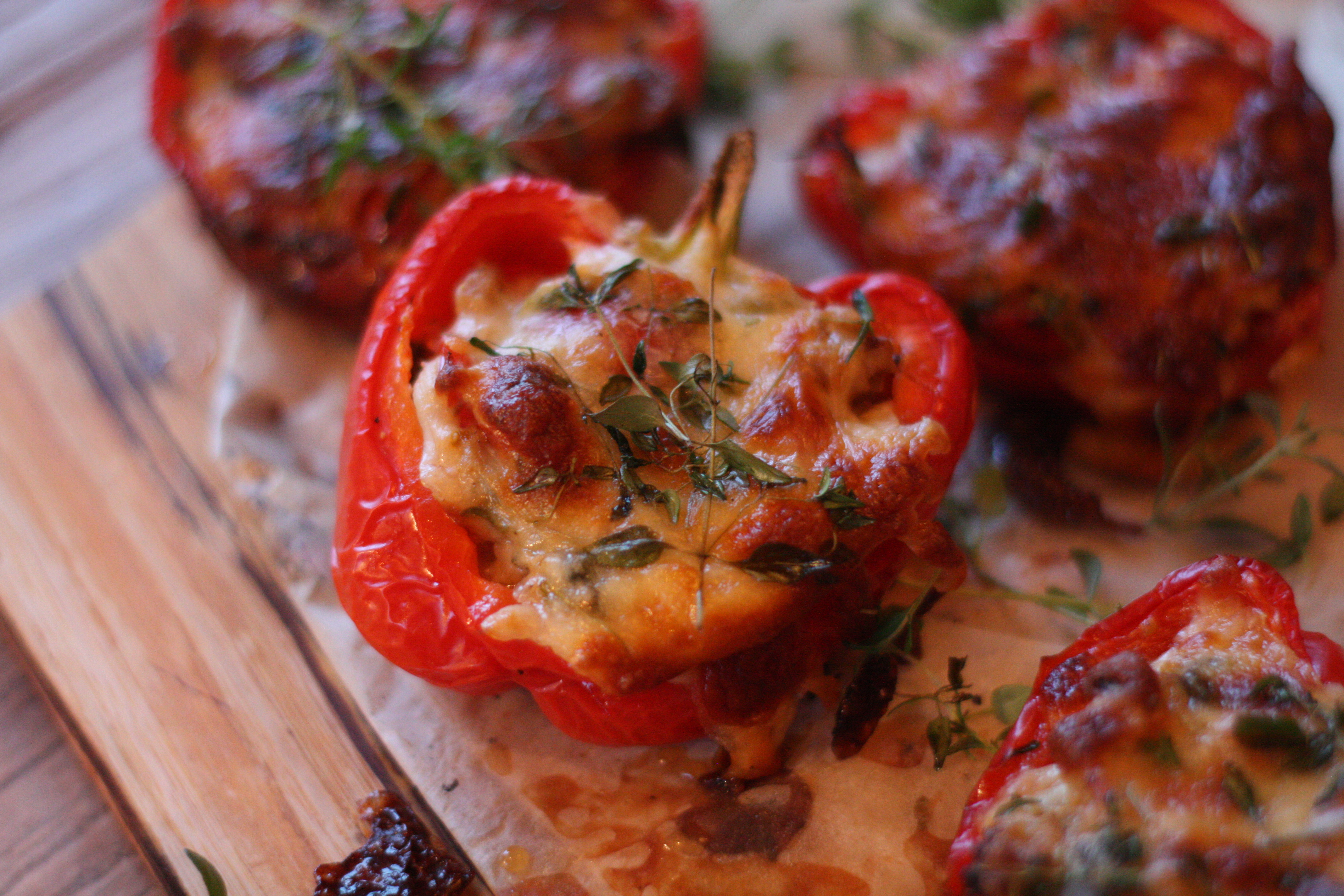 Dryss over mozzarella og topp med timian. Stek på 200 grader i ca. 30 min. De skal være gyldende.