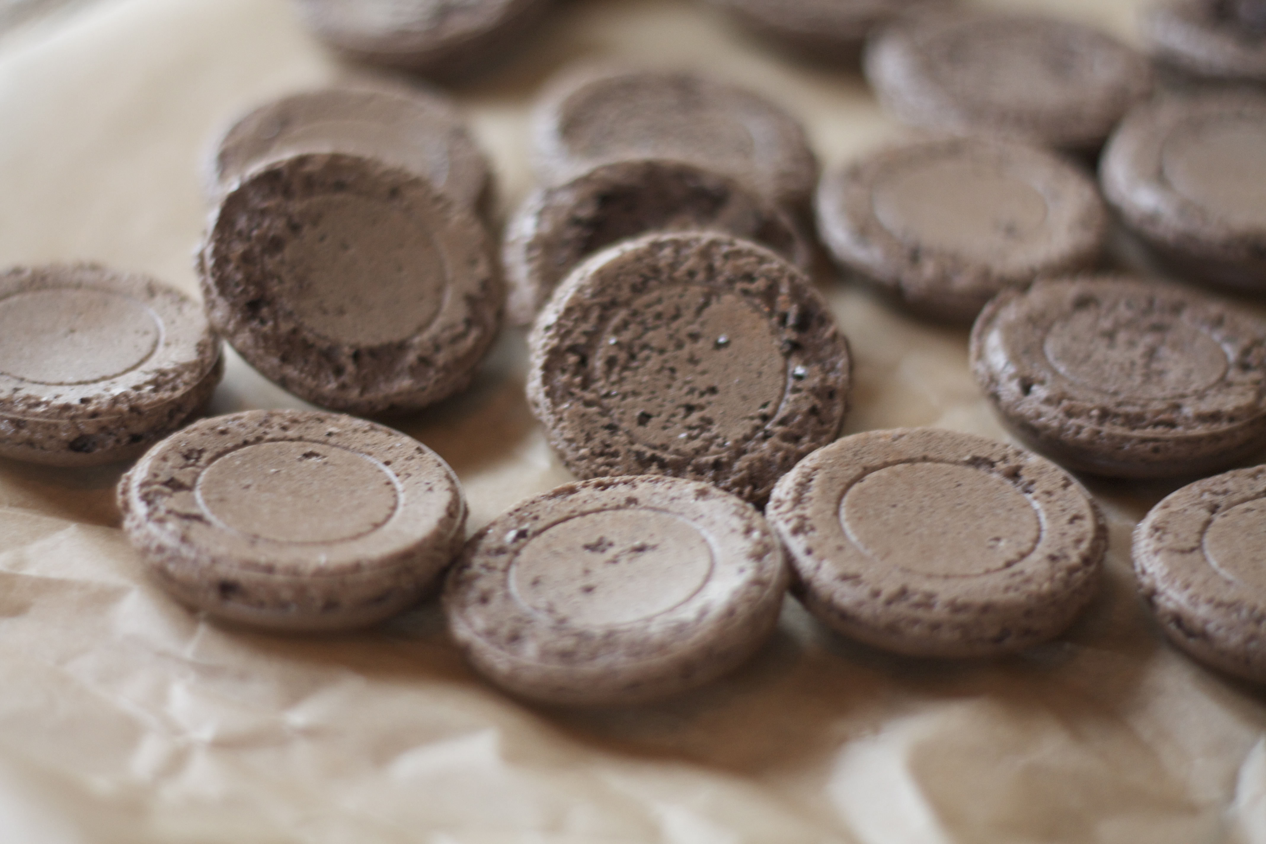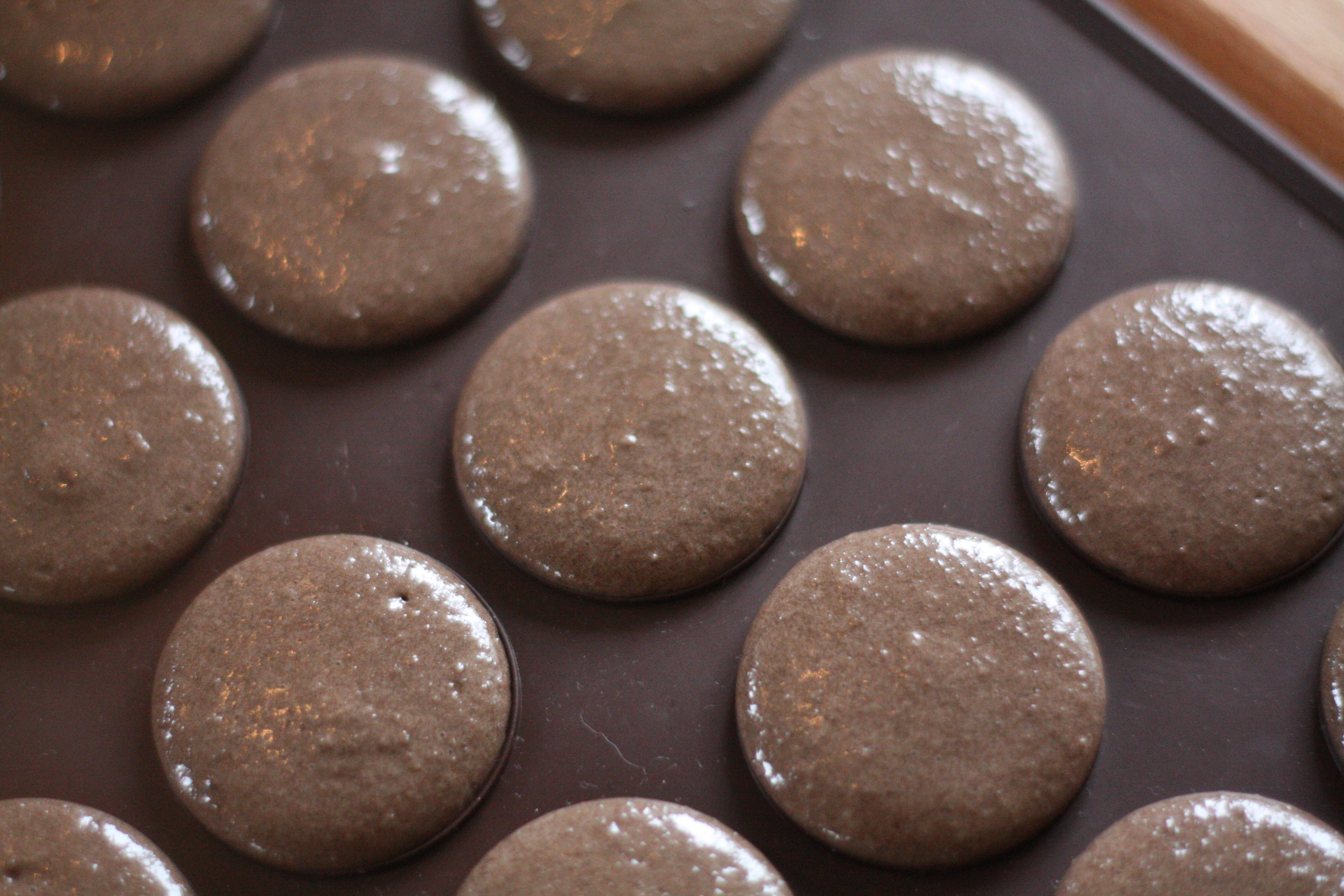 4. Ha røren i spørytepose med tipp, og sprøyt ut i sirklene. Har du ikke makronmatte, kan du fint bruke en femkroning og tegne sirkler med. La dem tørke i 30-60 min på kjøkkenbenken.