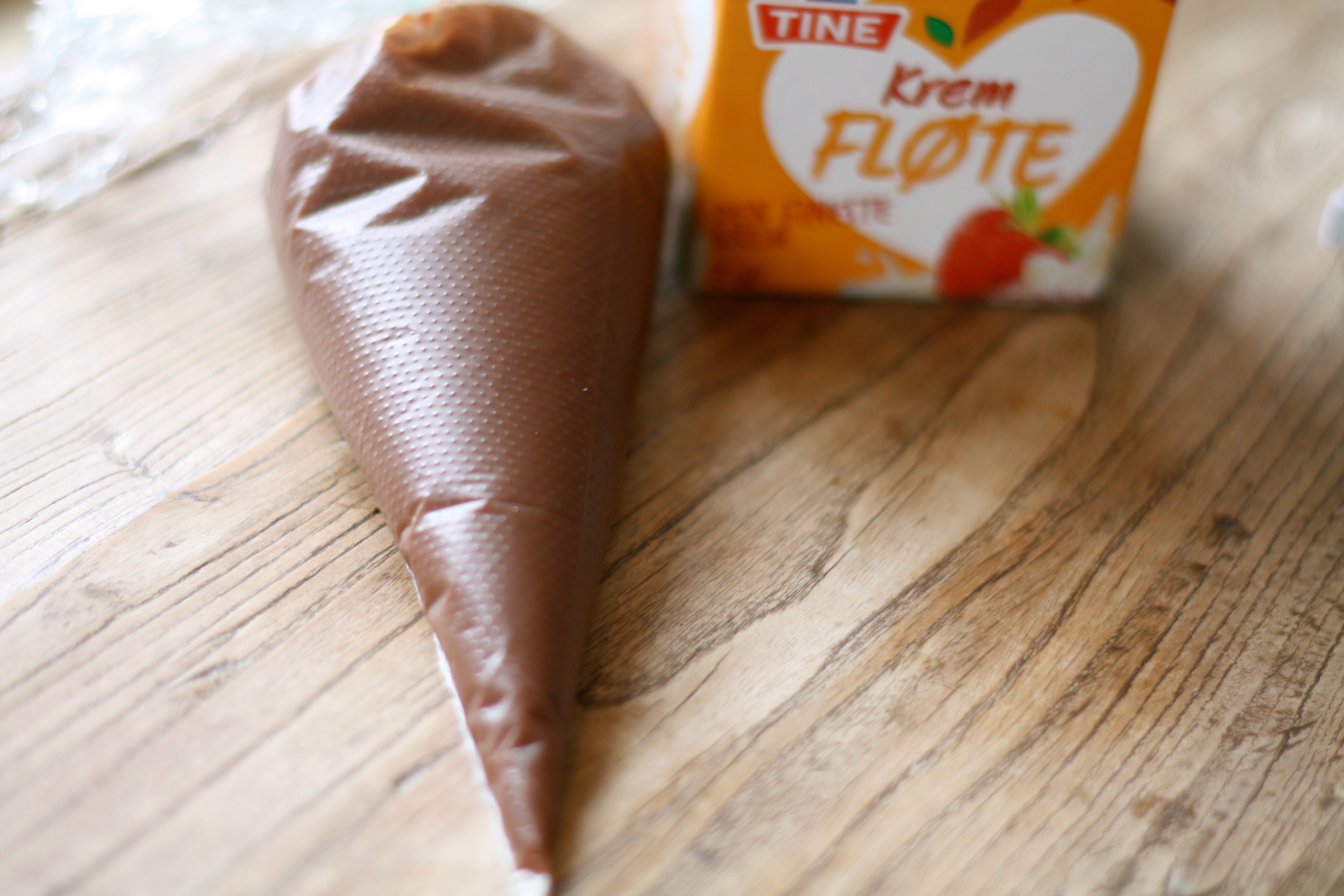 1. Kok opp fløten, hell den over sjokoladen. Miks godt sammen. Det er lurt å bruke en stavmikser, slik at du får en glatt røre. Ha den deretter over i en sprøyepose. La den ligge i kjøleskapet til den har stivnet.