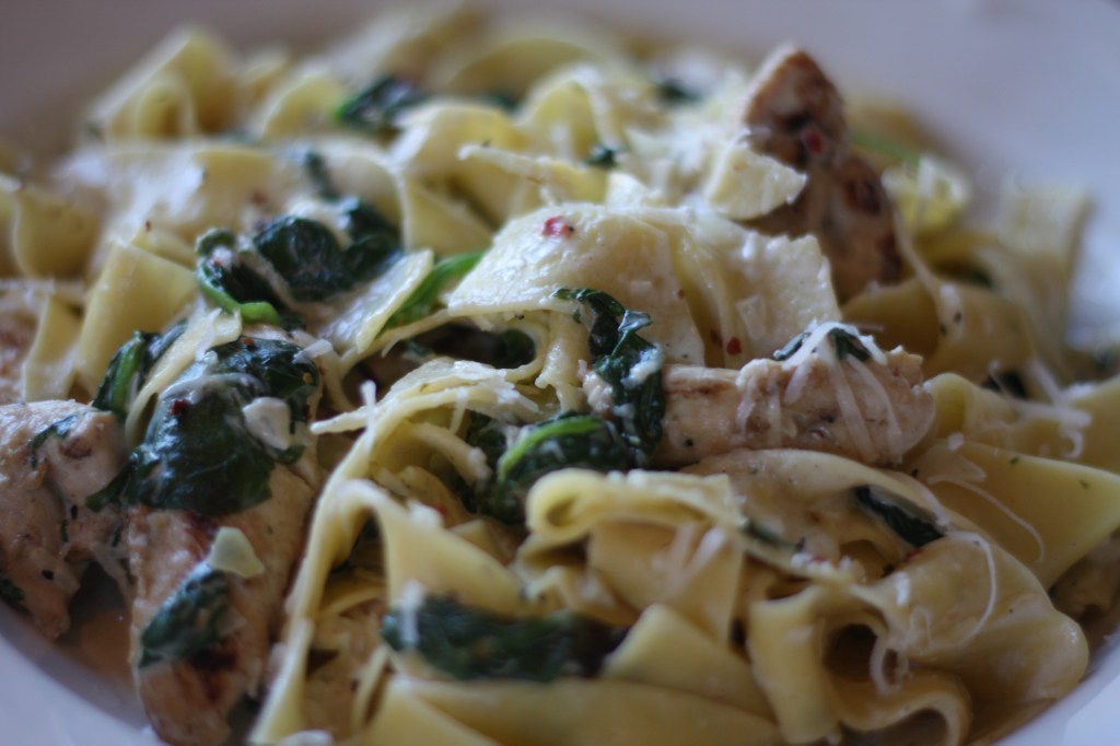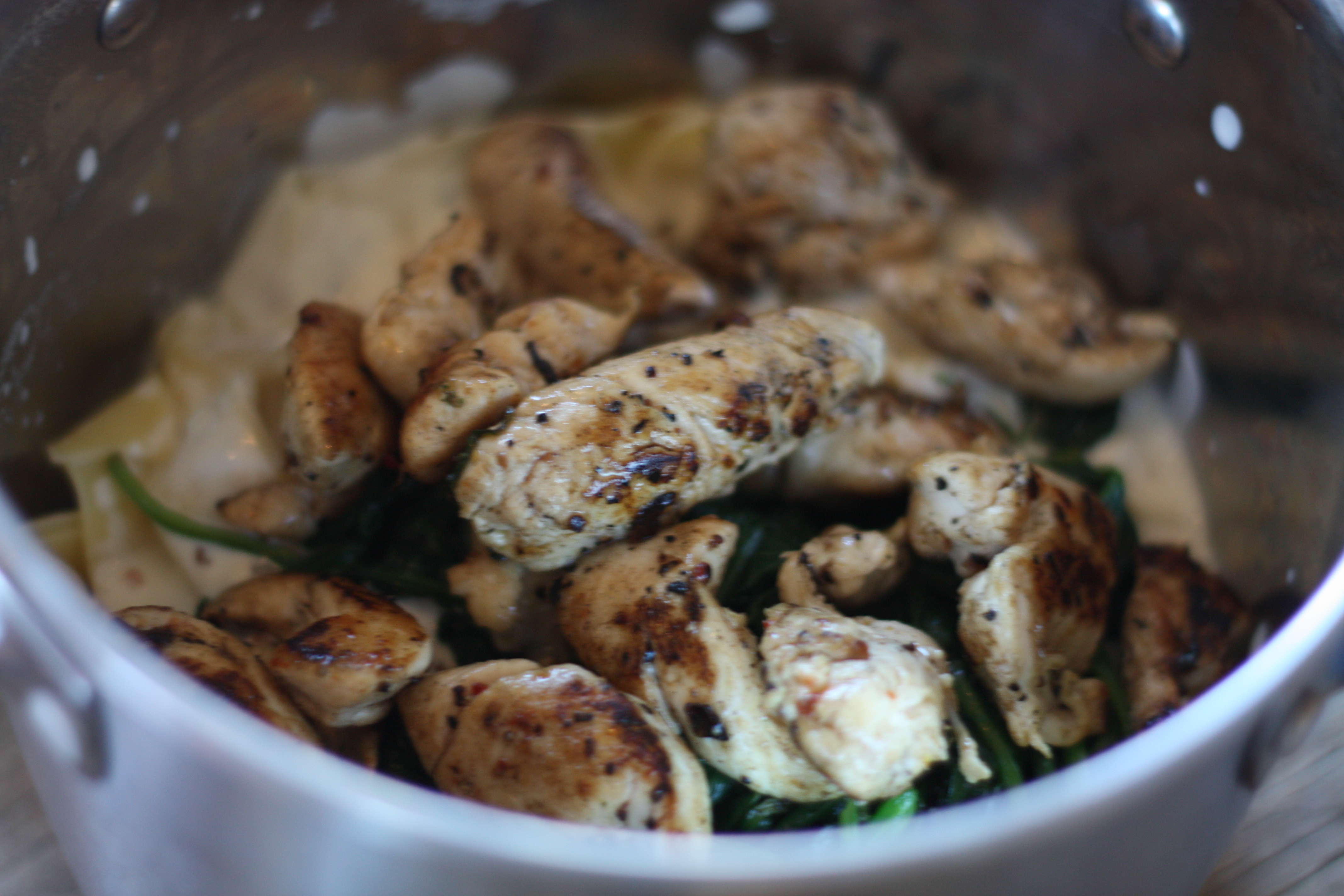 6. Hell fløtesausen, spinat, kylling over pastaen. Rør godt sammen.