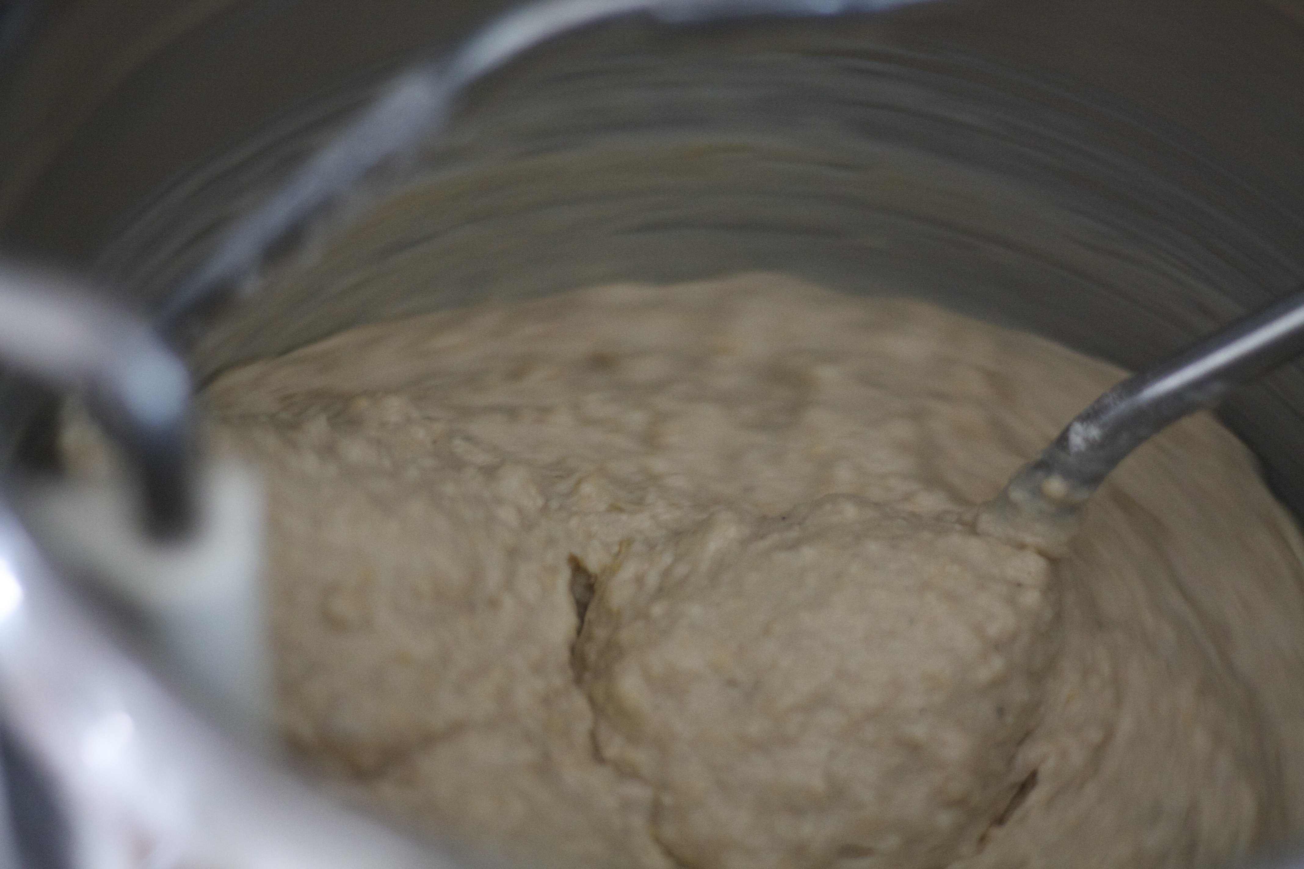 3. Tilsett den lunkende melken i en tynn stråle, mens maskinen går på lav hastighet. La den elte i 10 min før du tilsetter smøret.