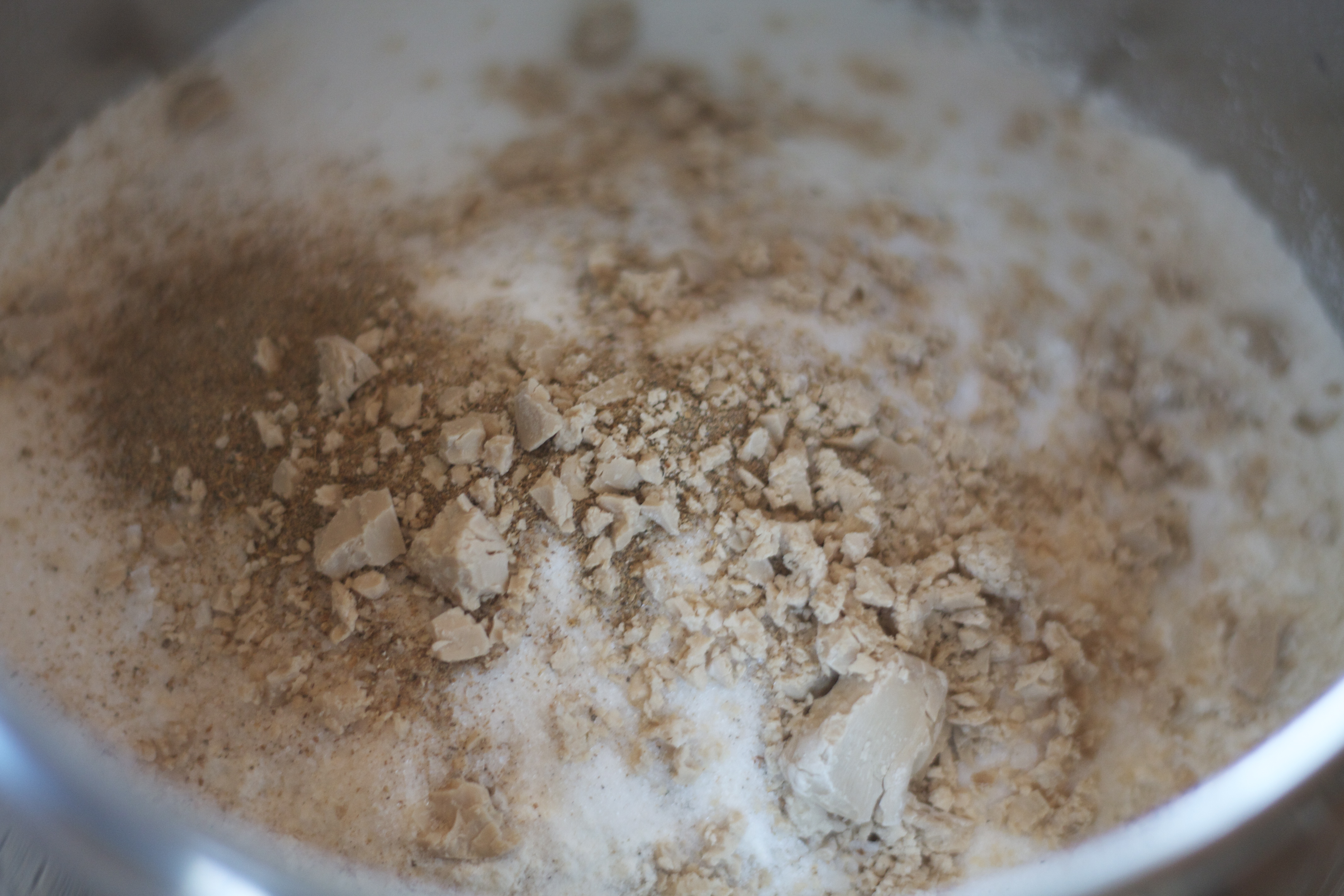1. Bland mel, sukker, salt, kardemomme og gjær i en bolle. Smuldre gjærene med hendene. Start kjøkkenmaskinen på lav hastighet med eltekrok.