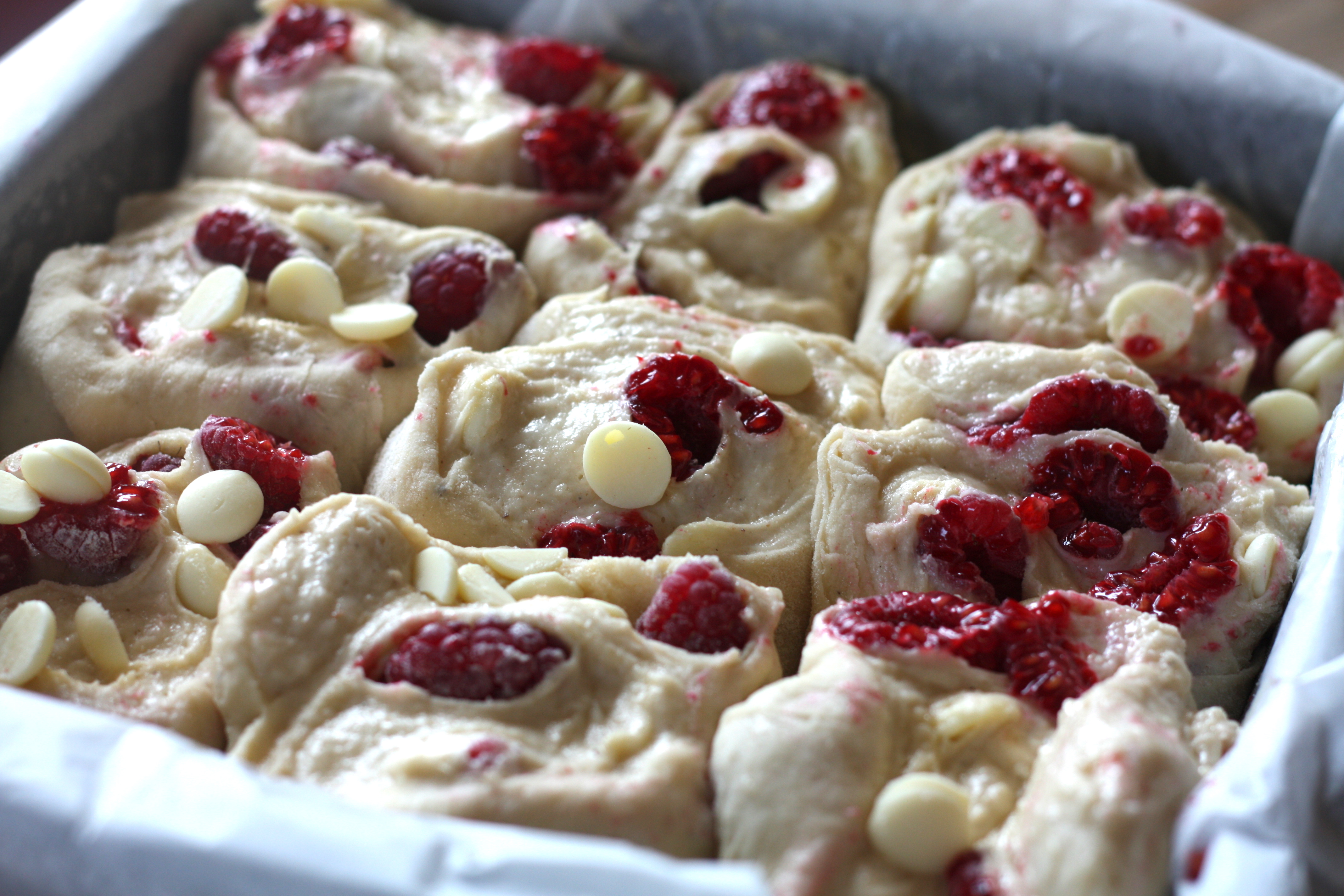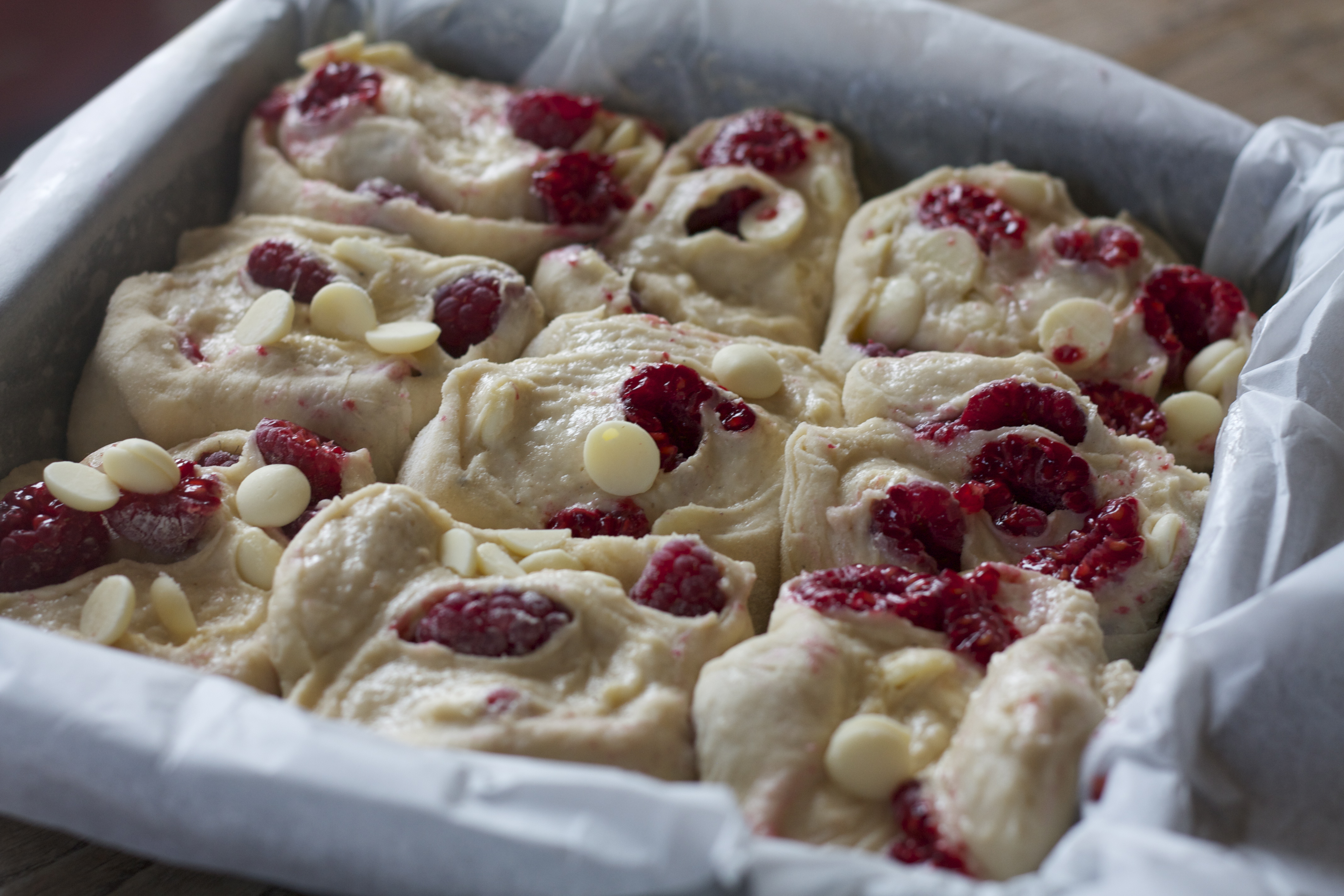 Bringebærboller med hvit sjokolade i form: ca. 1 form(halve oppskriften). Lag en langpanne, eller del deigen i to og lag kanelsnurrer/hveteboller.