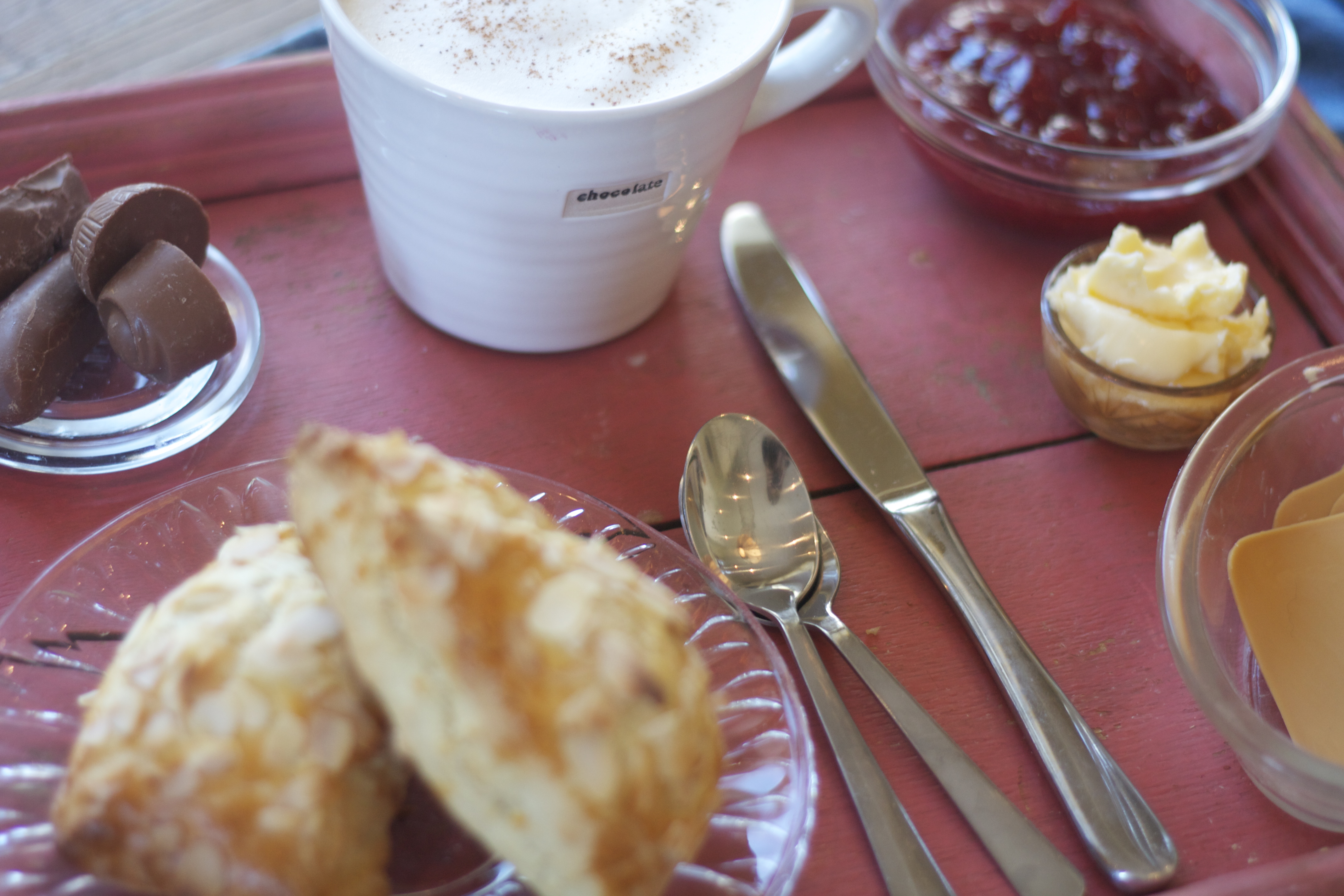Server med godt smør, hjemmelaget syltetøy og brunost. Mmm. En sjokoladebit til kaffen er heller ikke feil.
