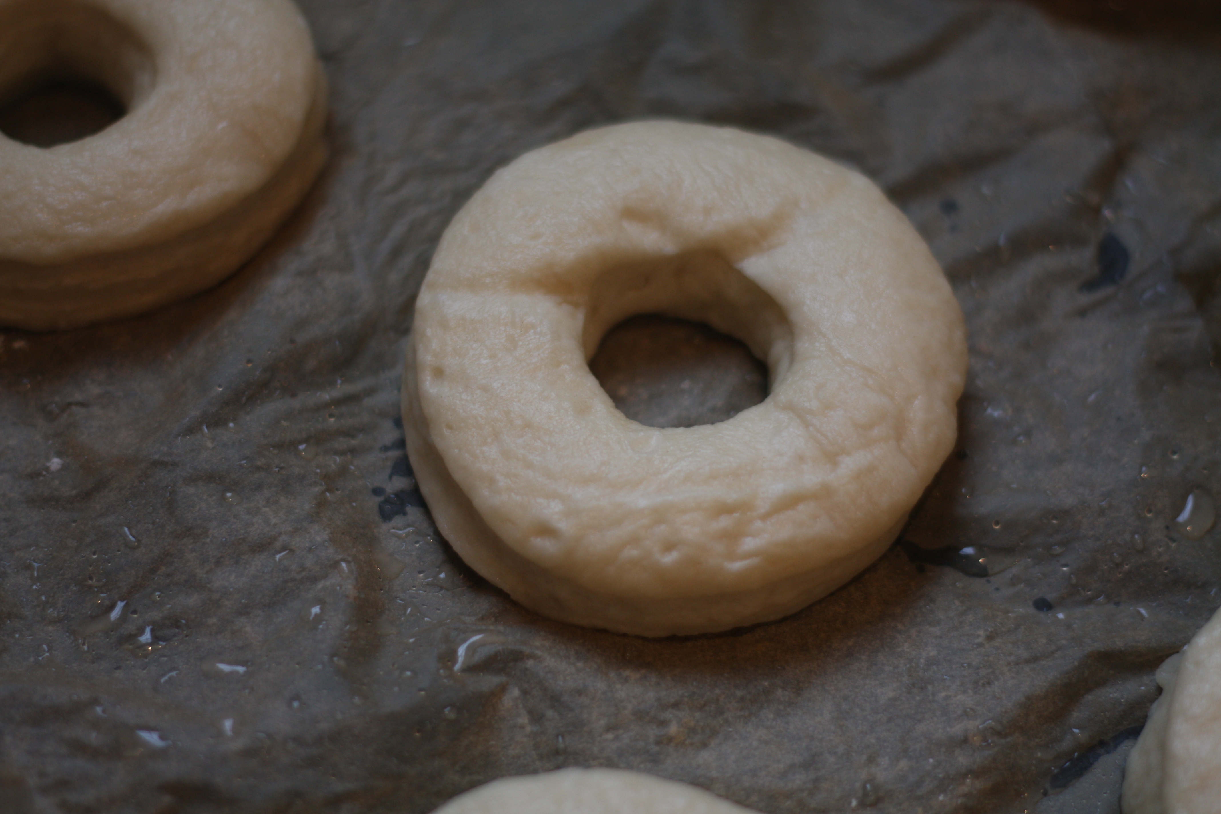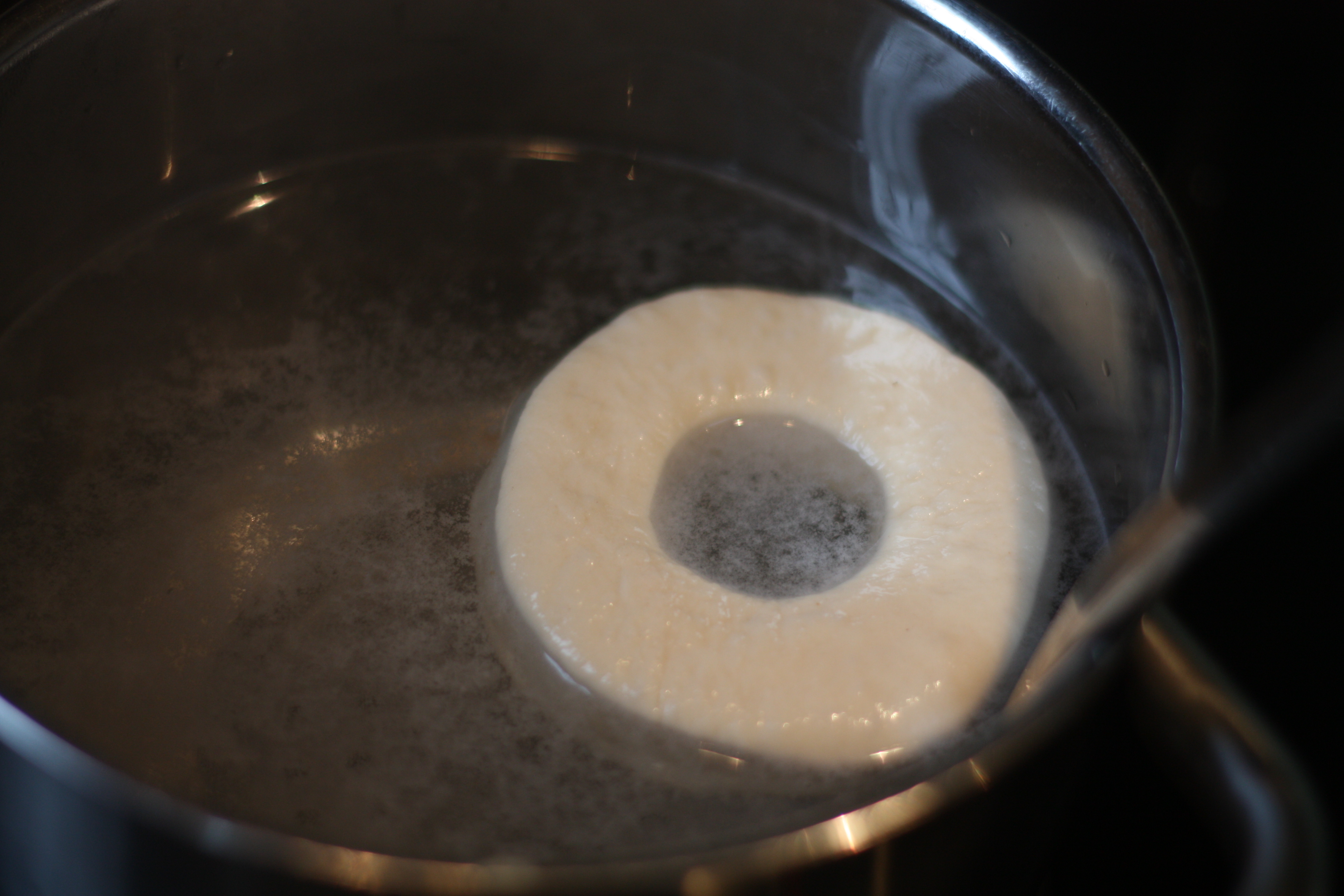 6. Kok opp vann og dypp bagelene nede. La de koke til de flyter opp 1- 2 minutter. Bruk en hullsleiv.