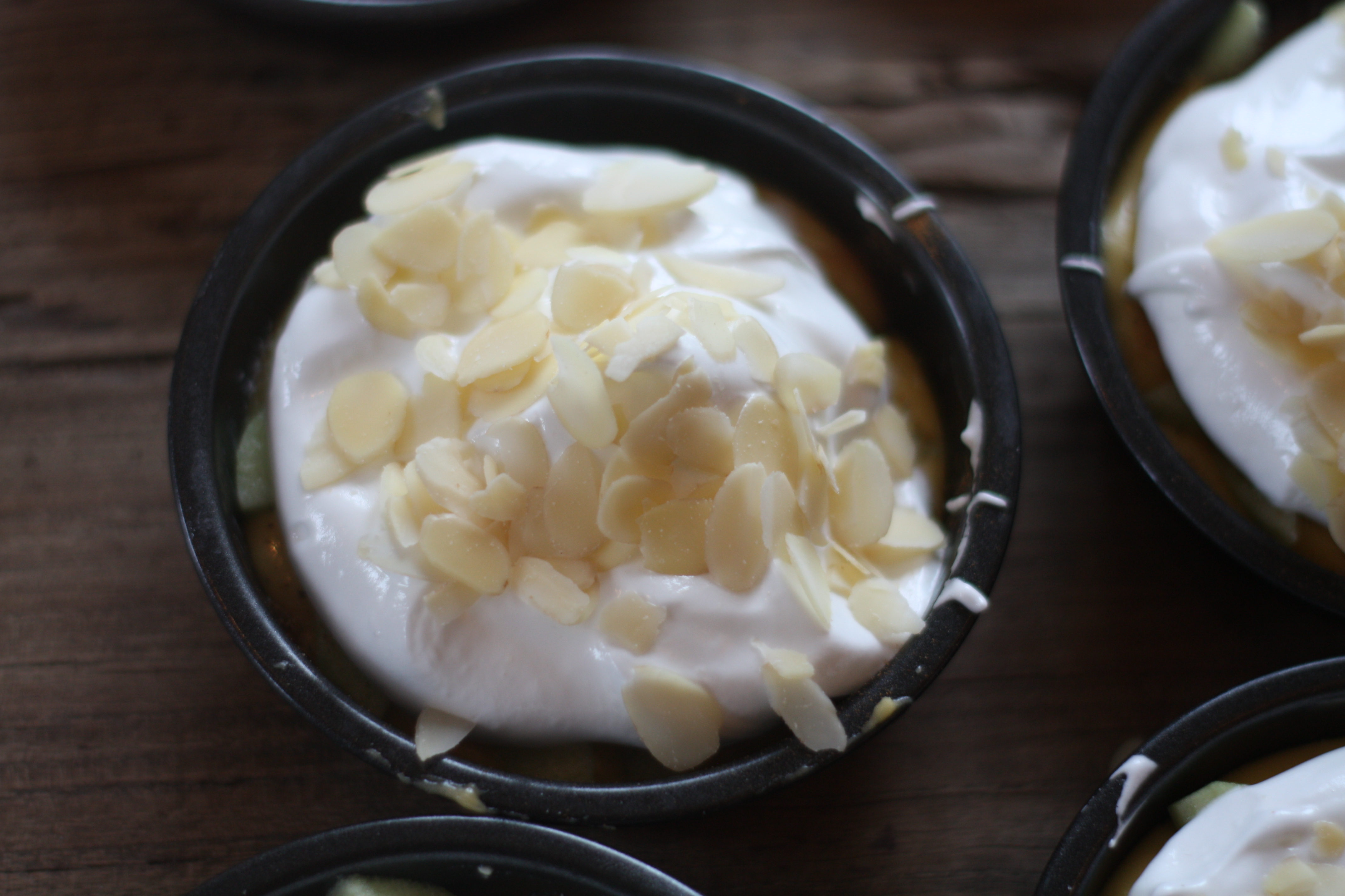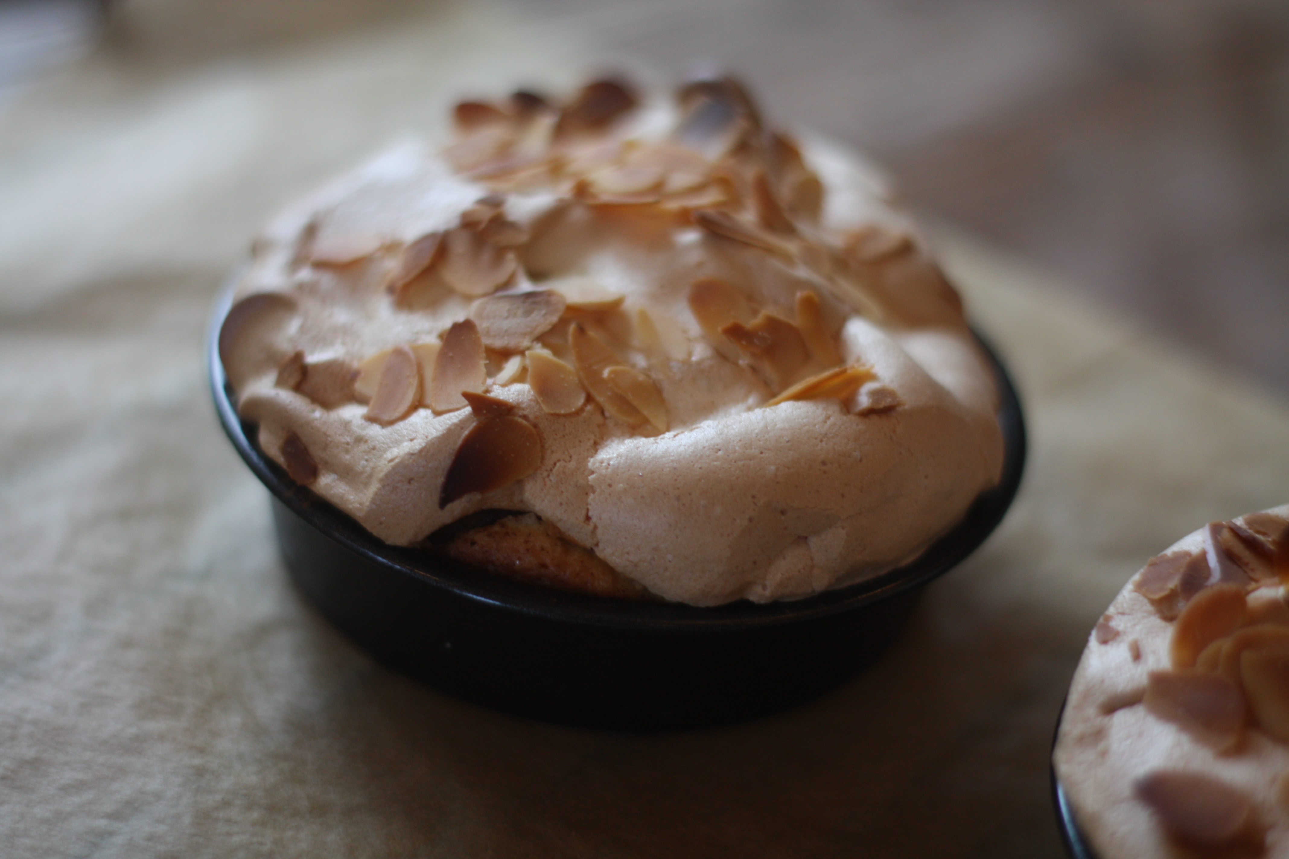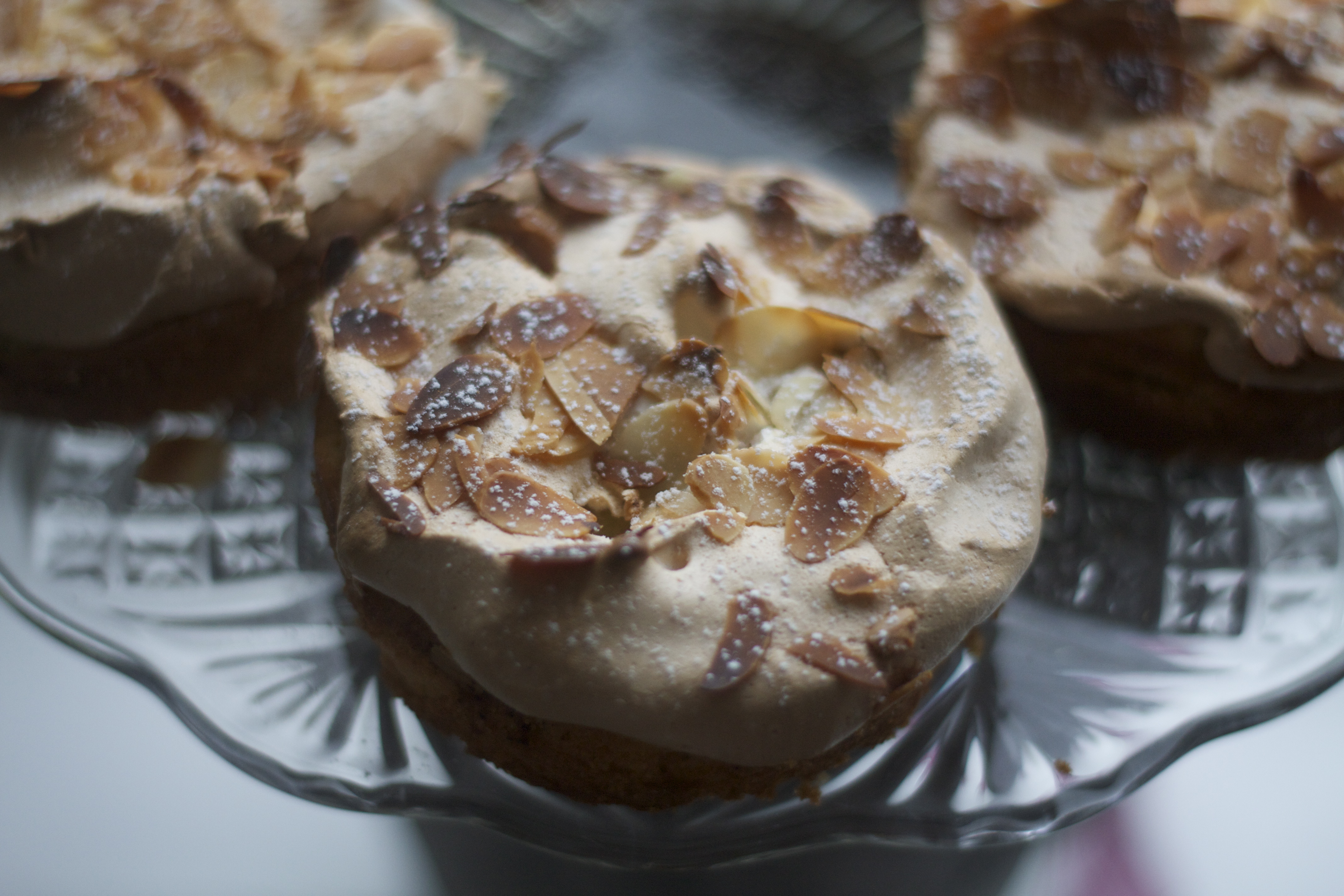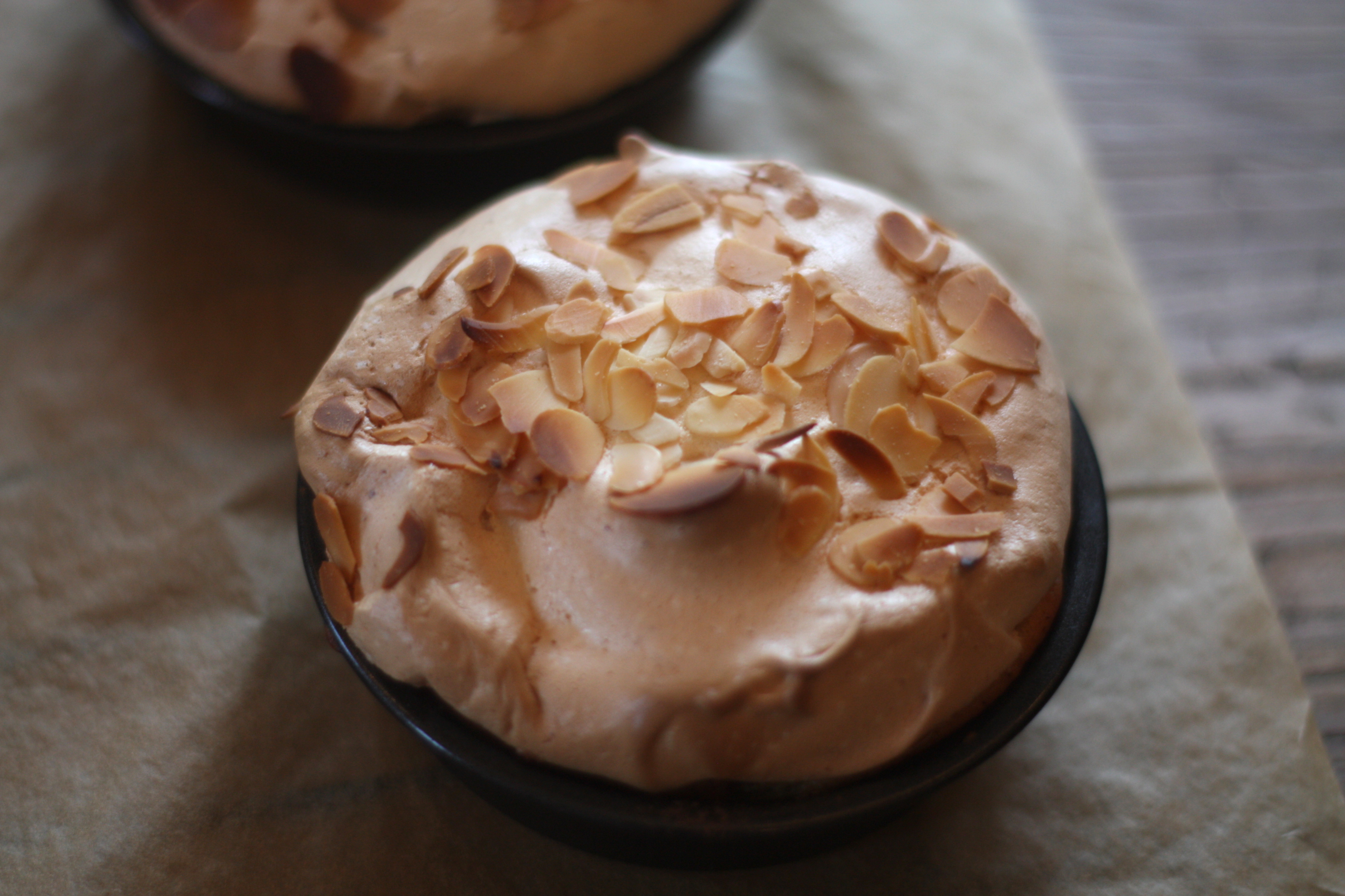 8. Fordel marengsen over eplekakene og dryss over mandelflarn.