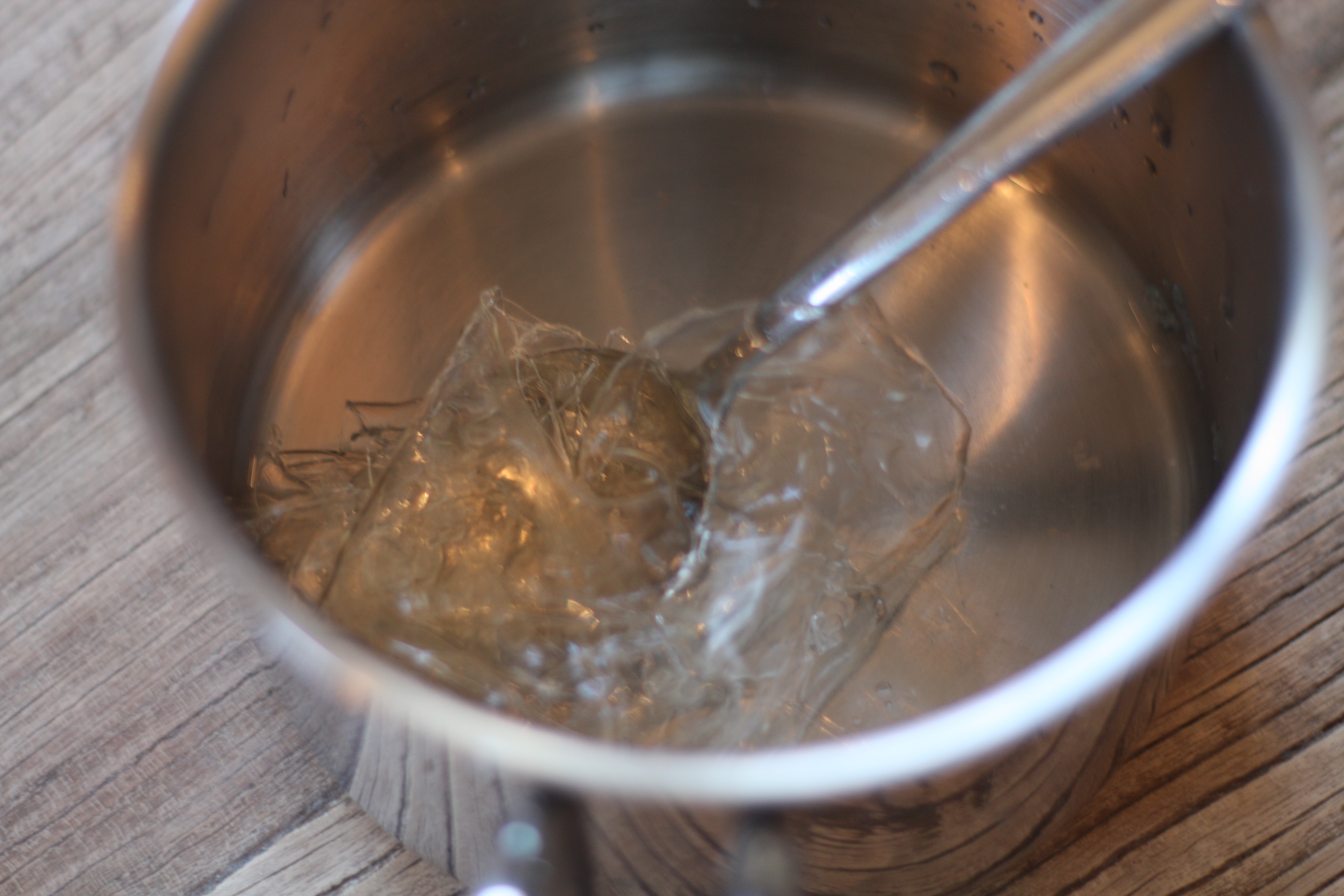 2. Klem vannet ut av gelantinplatene, smelt dem på lav varme sammen med fire spiseskjeer vann. Jeg hadde mine kokeplater på 2.