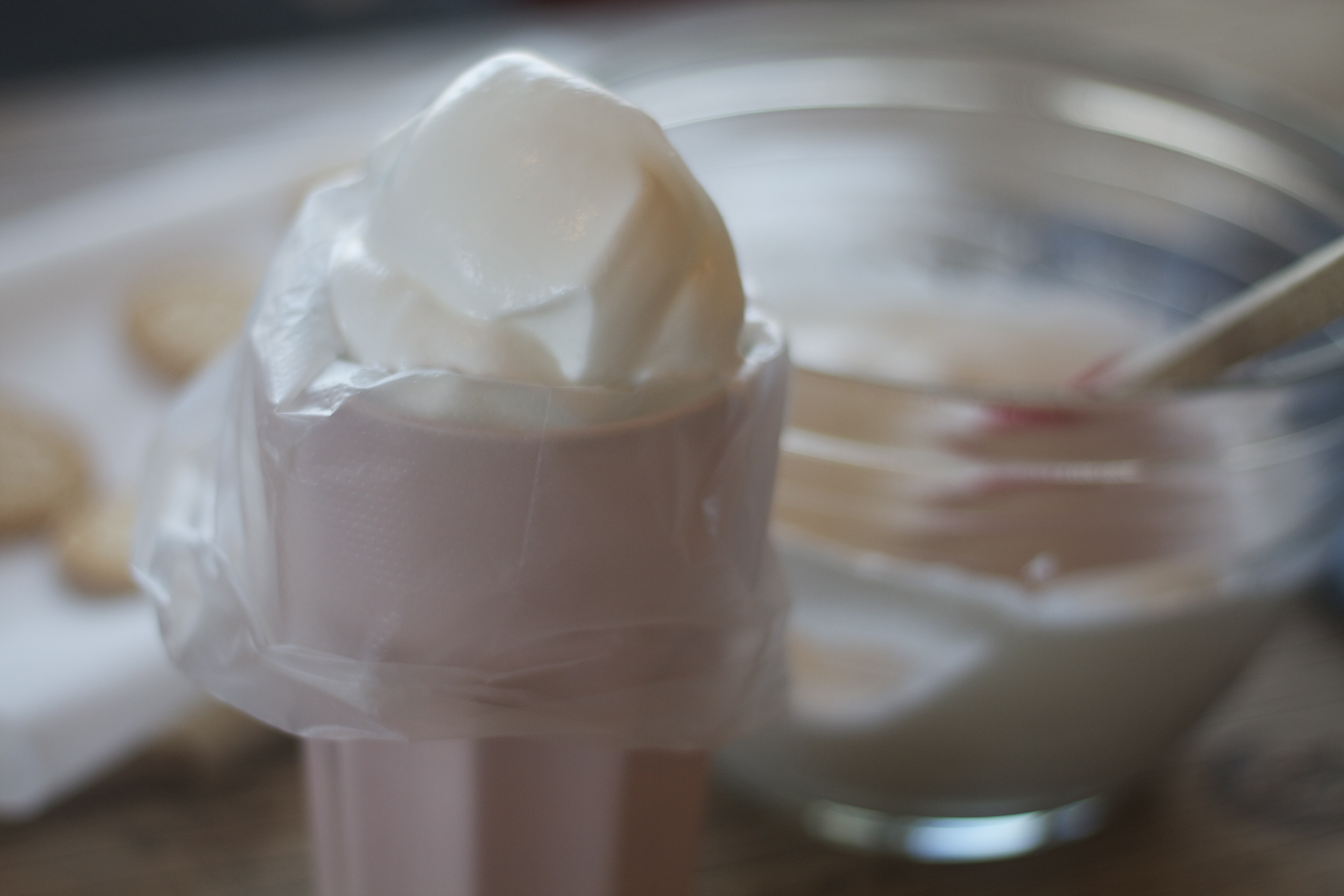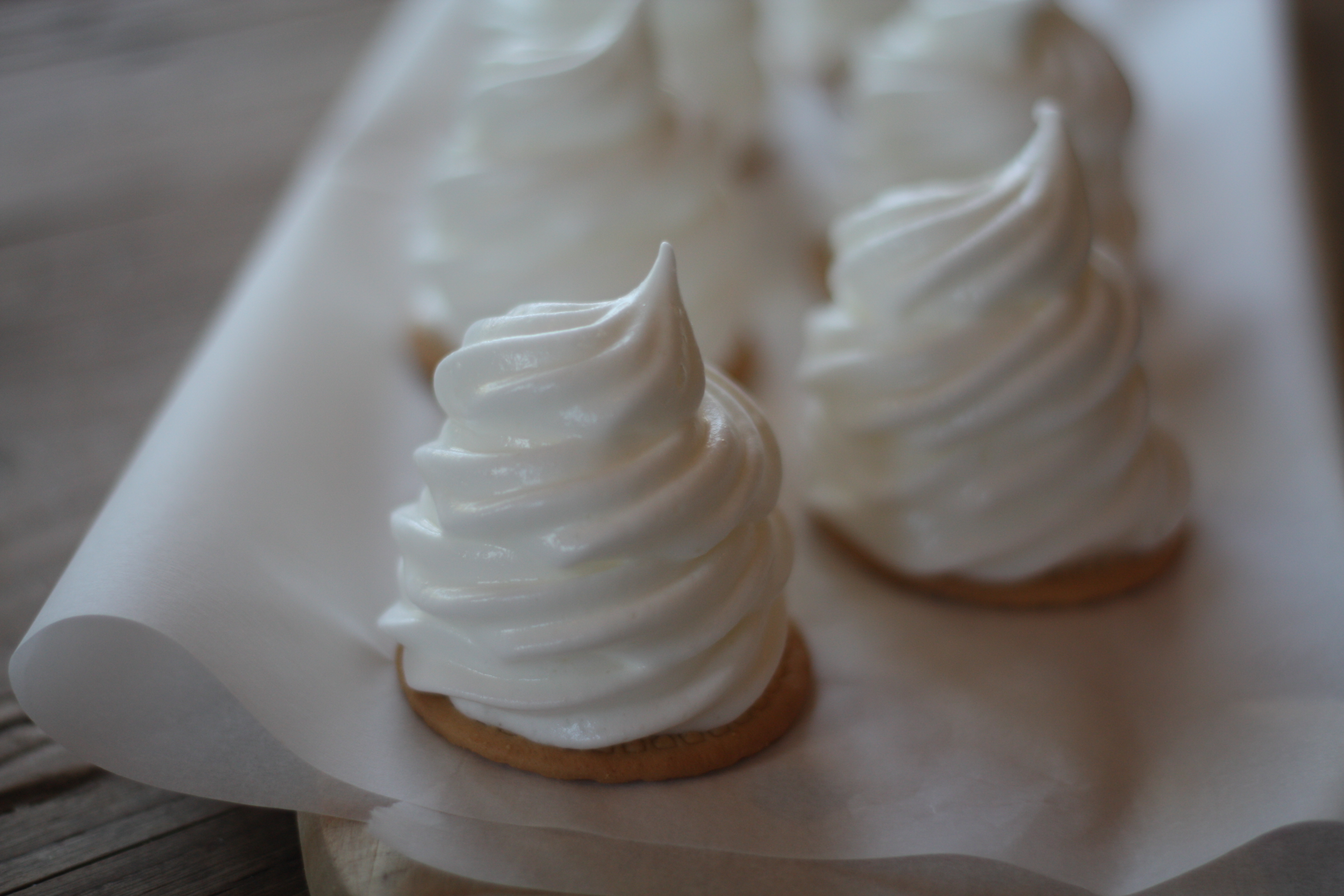 4. Ha marengsen i en sprøytepose med tipp, og sprøyt ut topper. Jeg bruker å sette sprøyteposen i en dyp kopp, og fylle med marengs. Unngår du å søle.