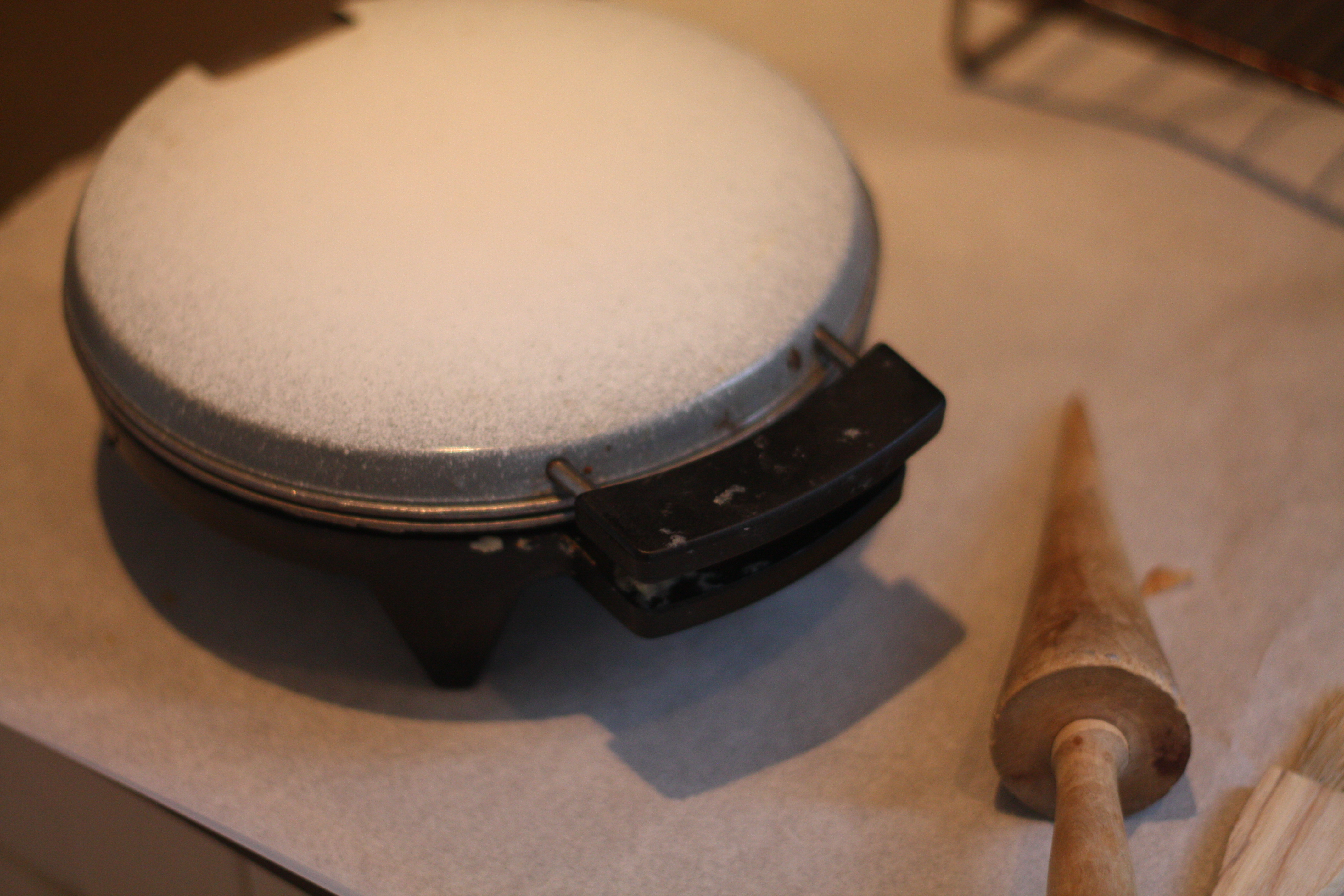 7. Jeg bruker elektrisk krumkakejern. Stek til en gyldenfarge, og rull dem med en krumkakeruller. Du kan ogsåsett ned i glass(da får du små skåler) eller med en pinne. Steker du krumkakene brune, sprekker de. De må være gyldene og rulles med engang.