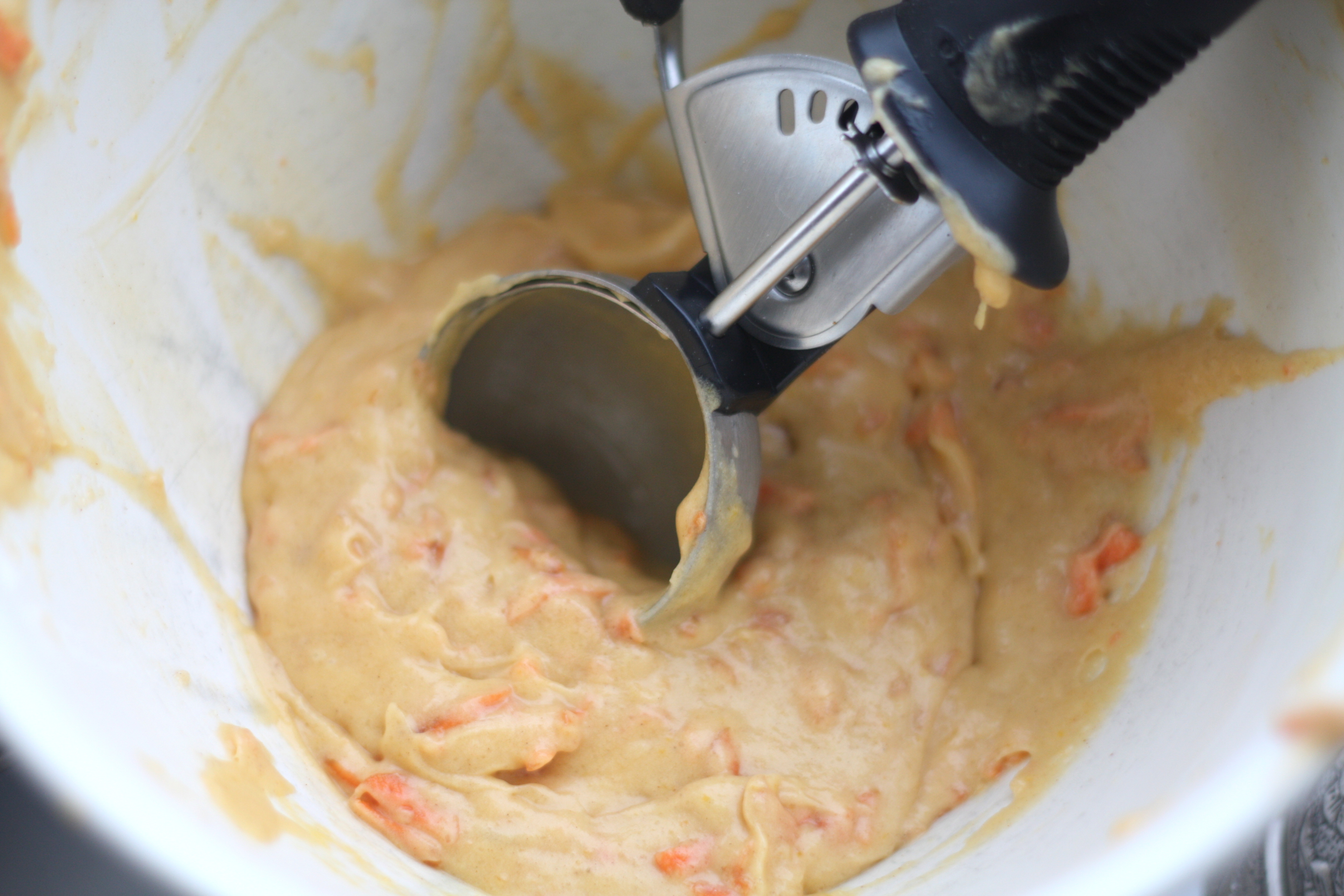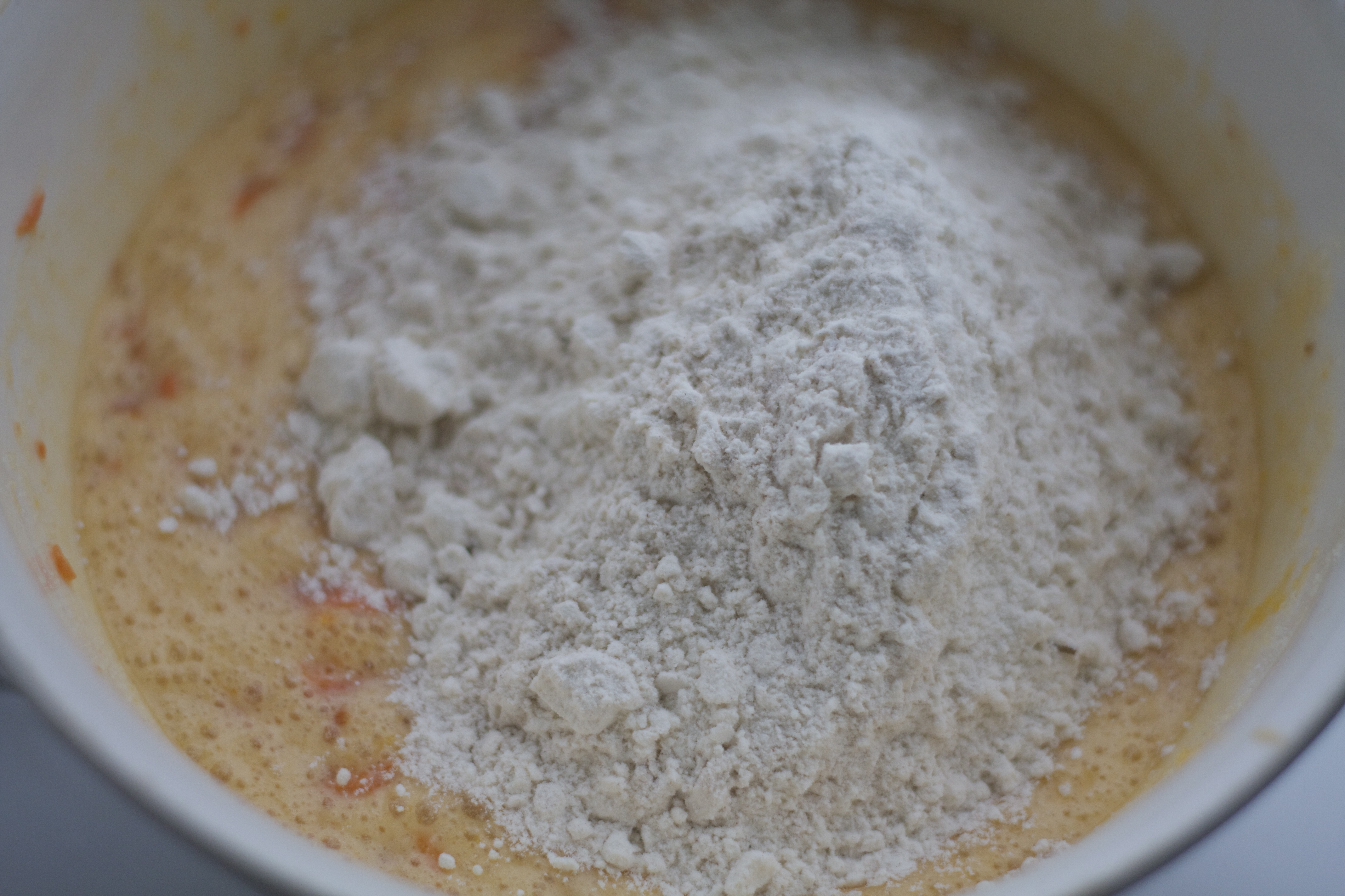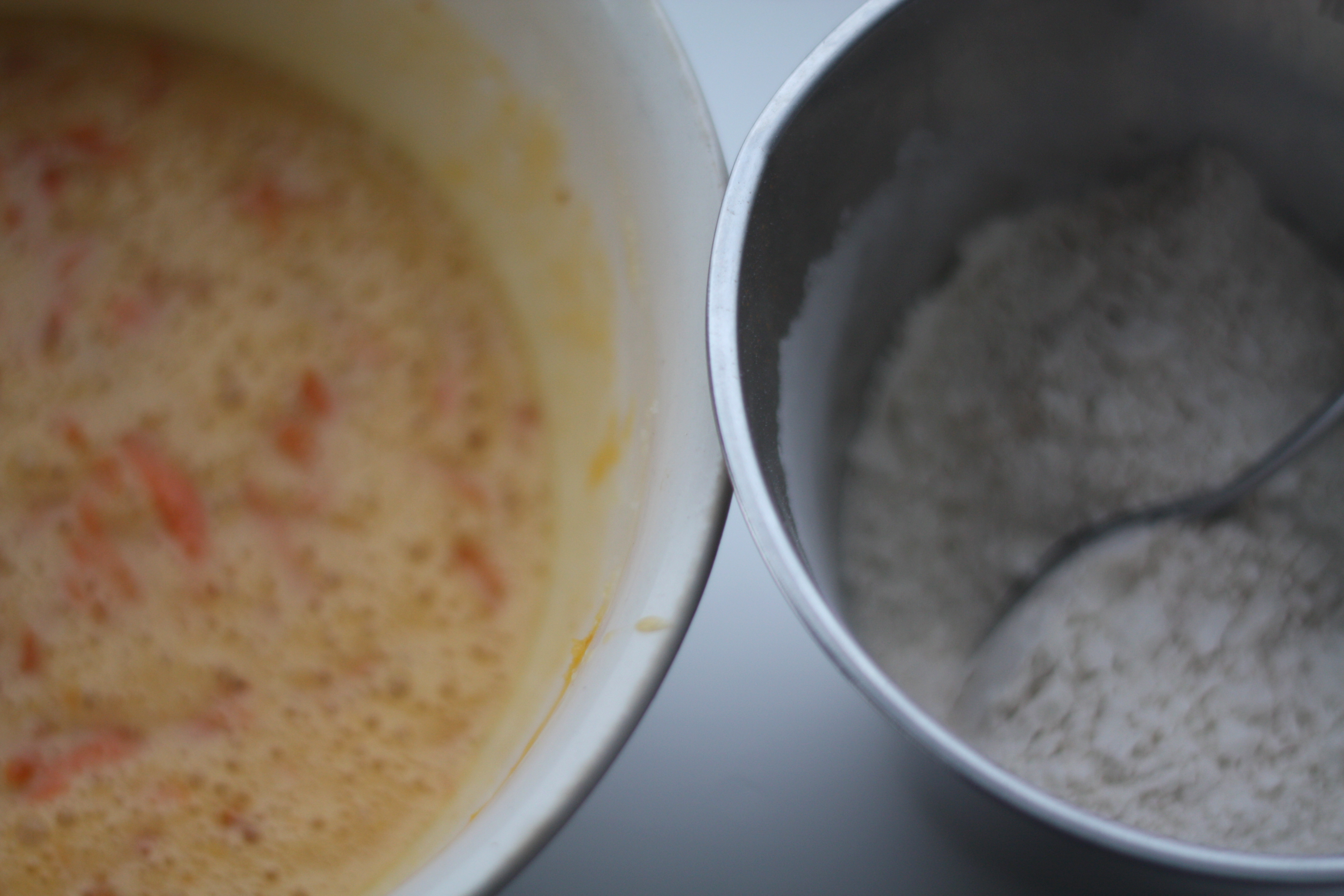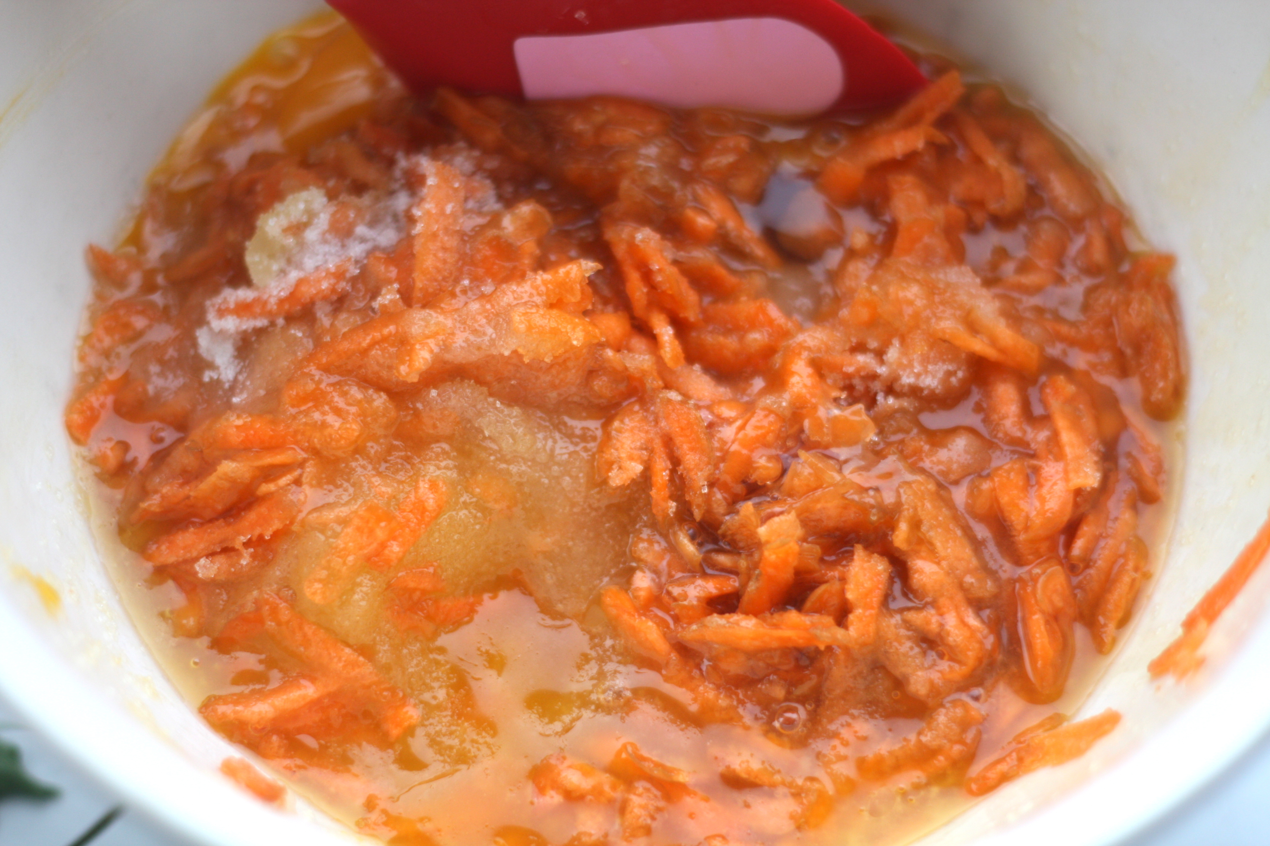 1. Miks sammen smeltet smør, revet gulrøtter, sukker og egg.