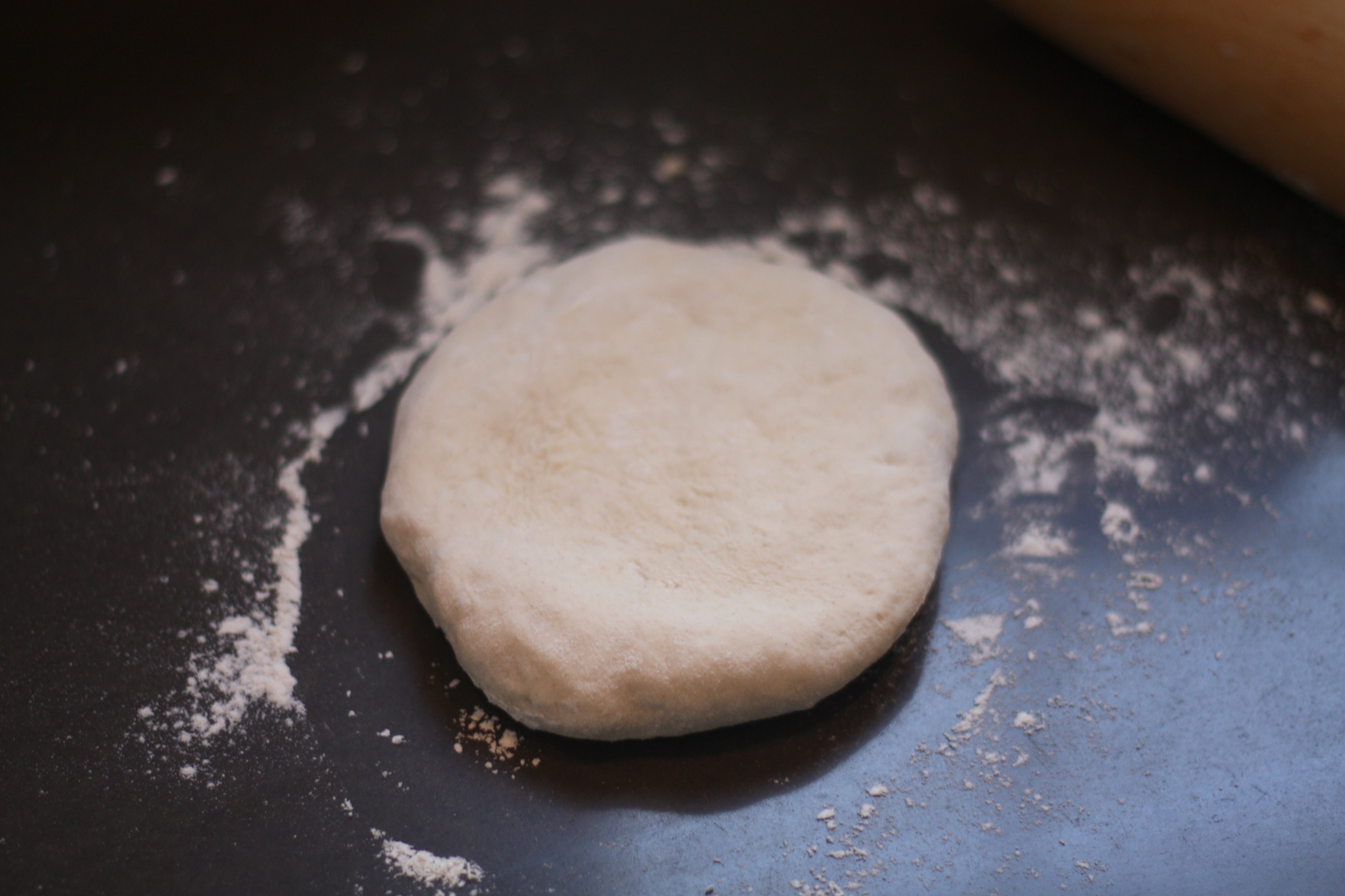 1. Sett ovene på 250-300 grader(høyeste som går) med pizzasteinen inni. Har du ikke pizzastein sett inn bakebrett. Slik at brettet/steinen er glovarm når du skal legge på deigen. Kjevle deigen rund og tynn. Denne deigen går det også å dra godt med.