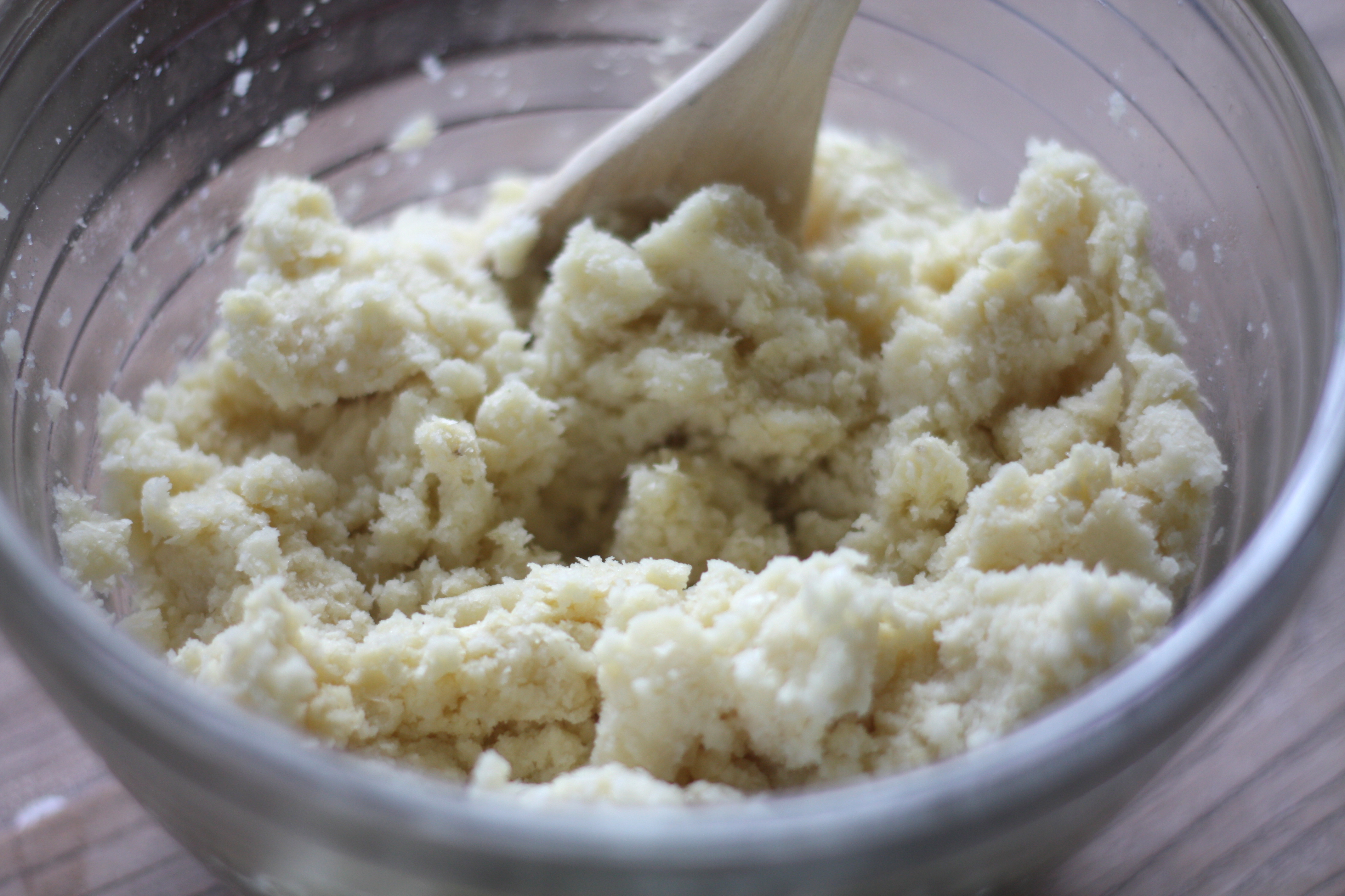 1. Bland sammen potetmosmiksene, salt og vann. La det svelle noen minutter, før du vender inn melet. Form deigen til en rund bolle.
