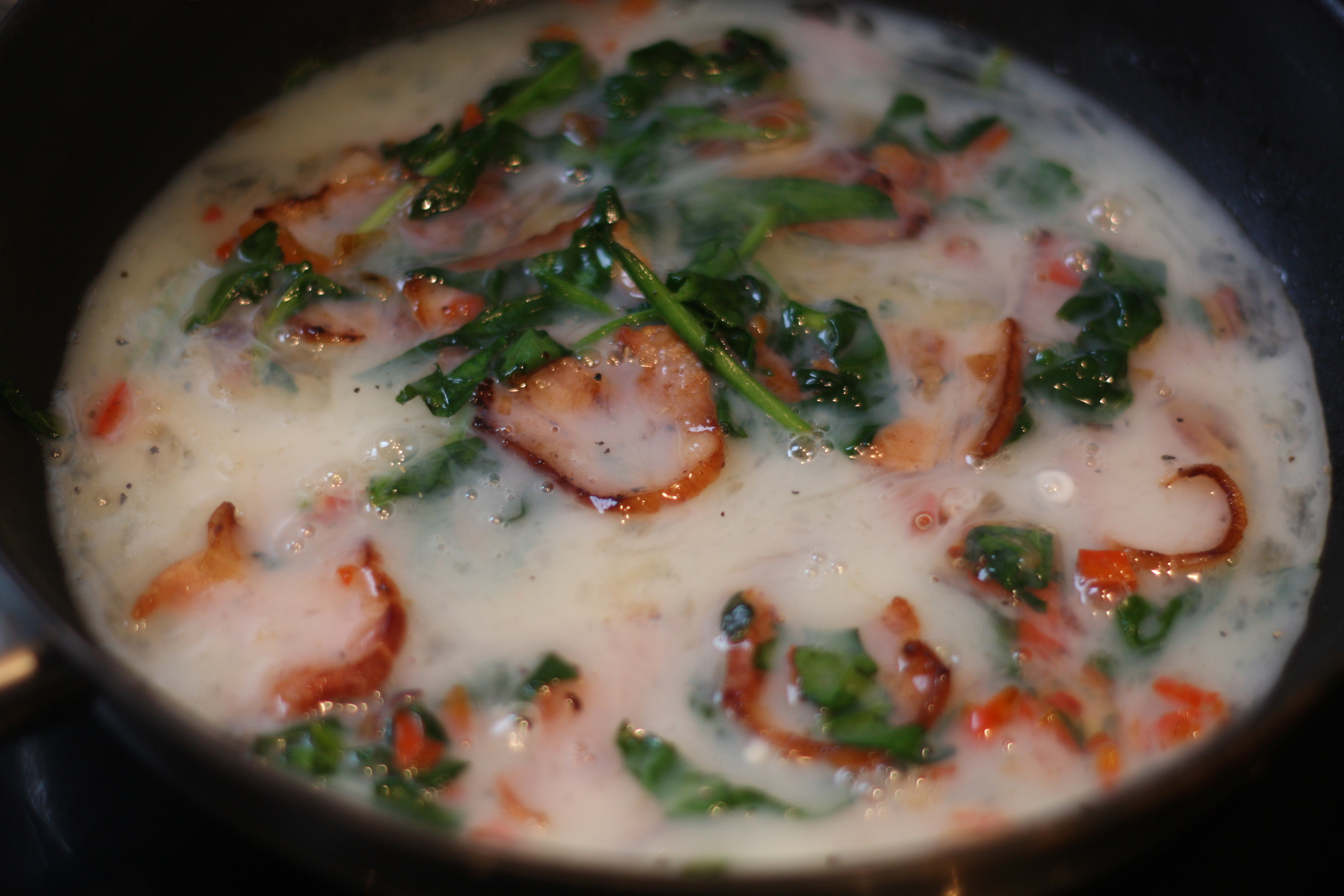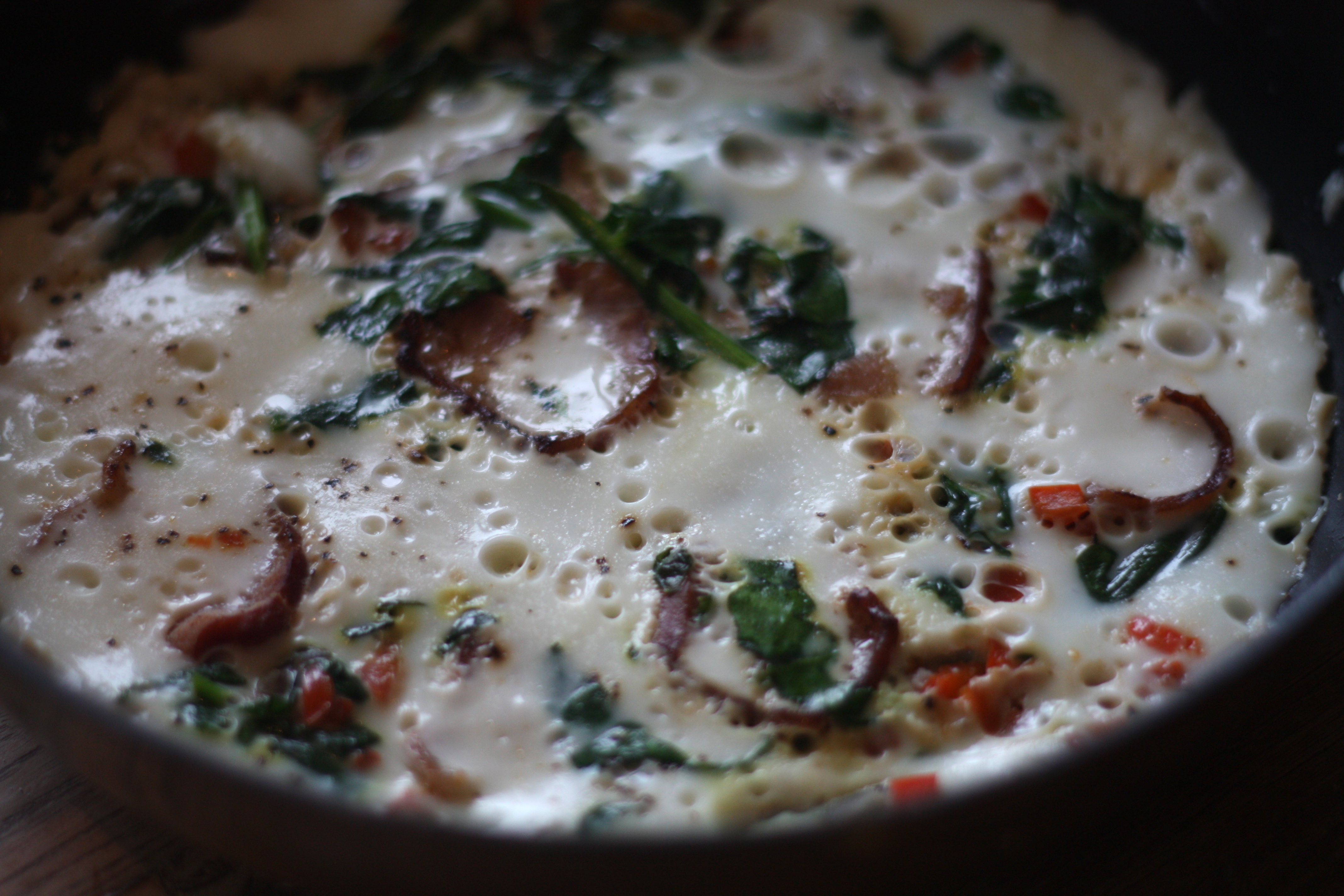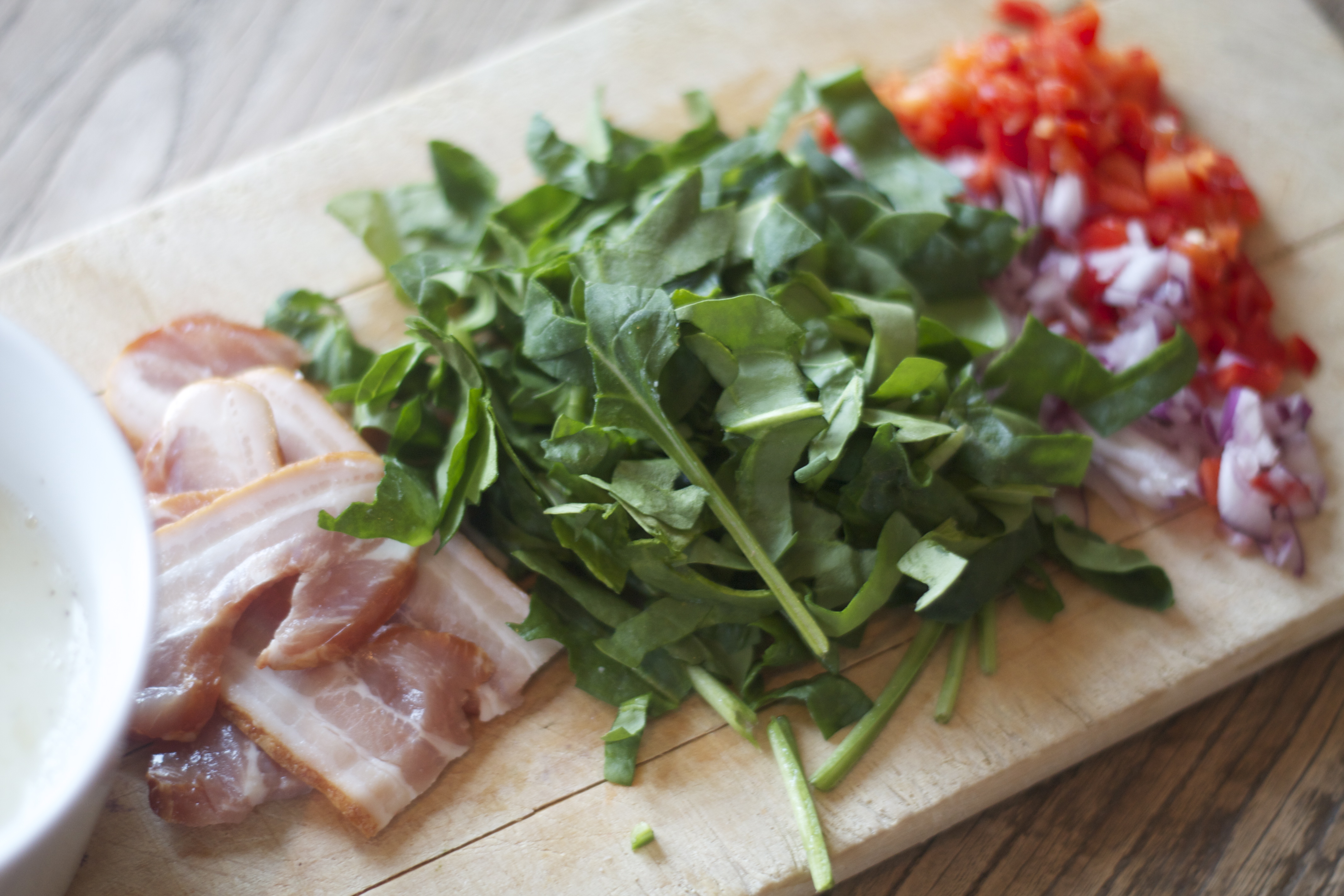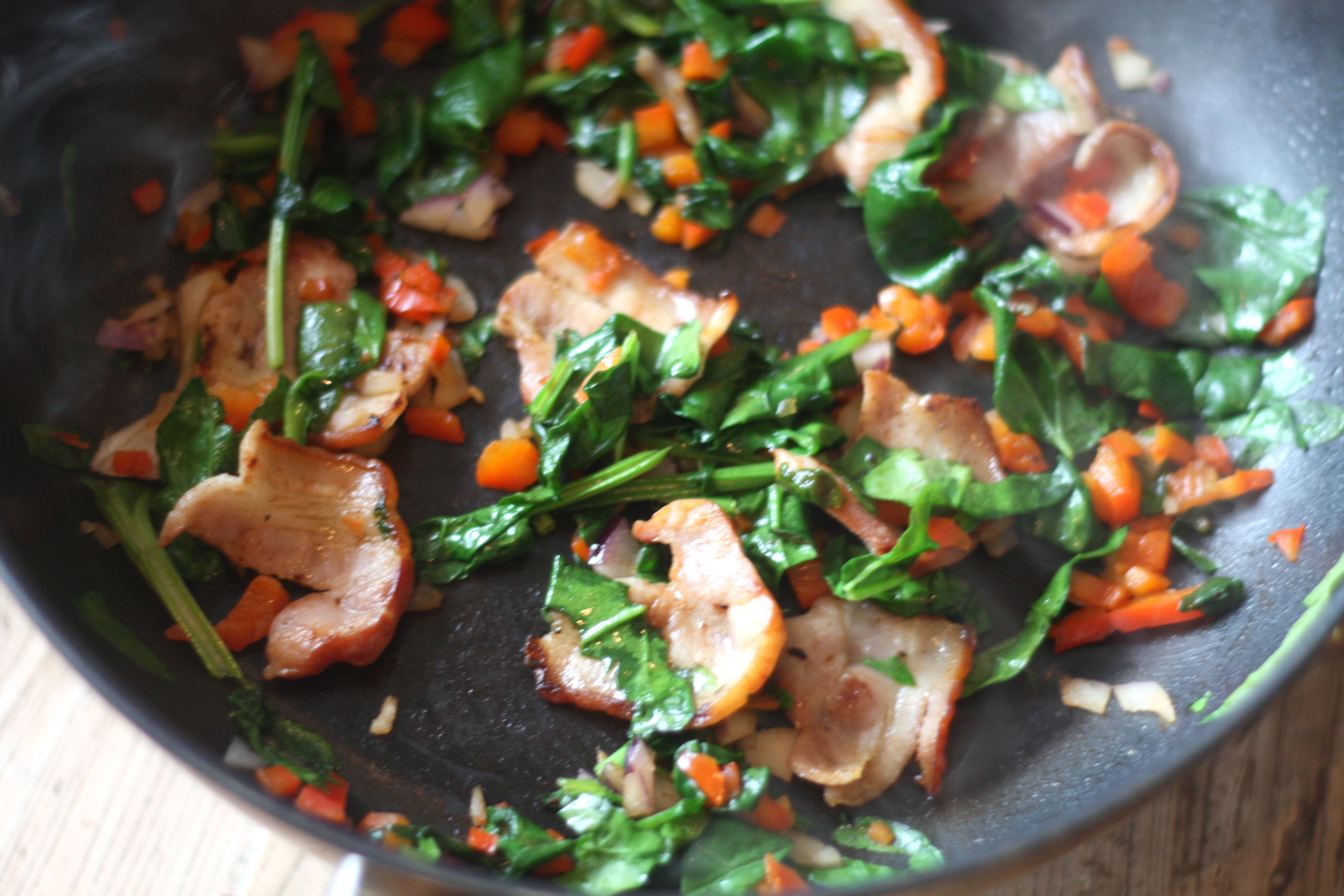 3. Fres bacon og grønnsakene i stekepannen. Til baconet blir gyldent og spinaten faller sammen.