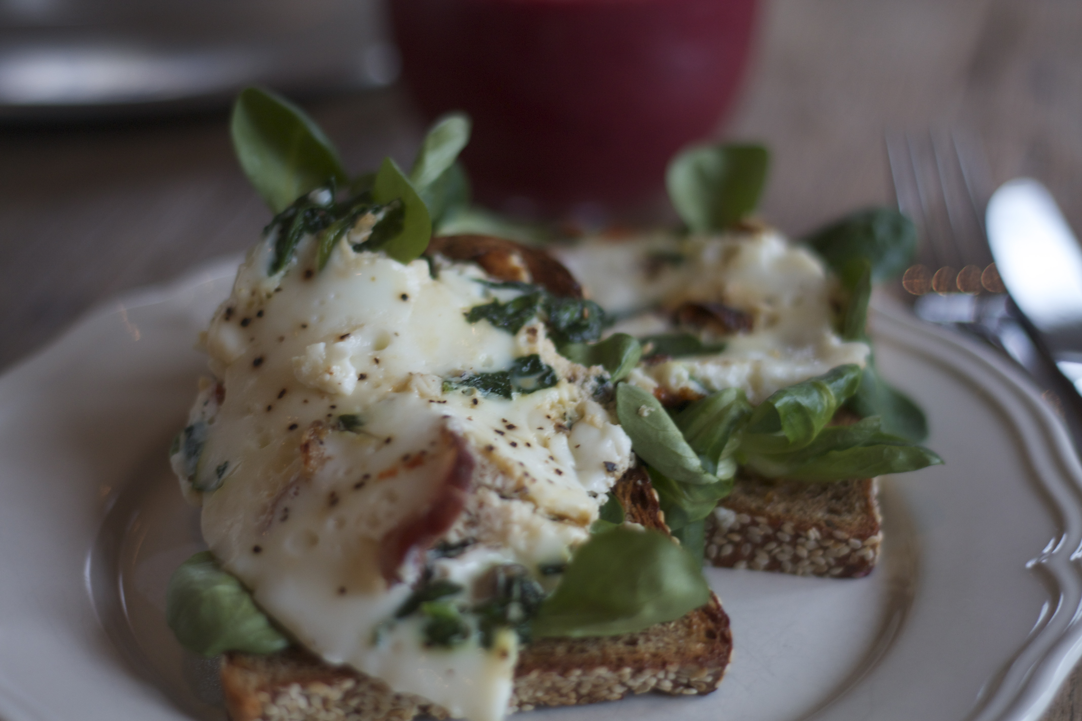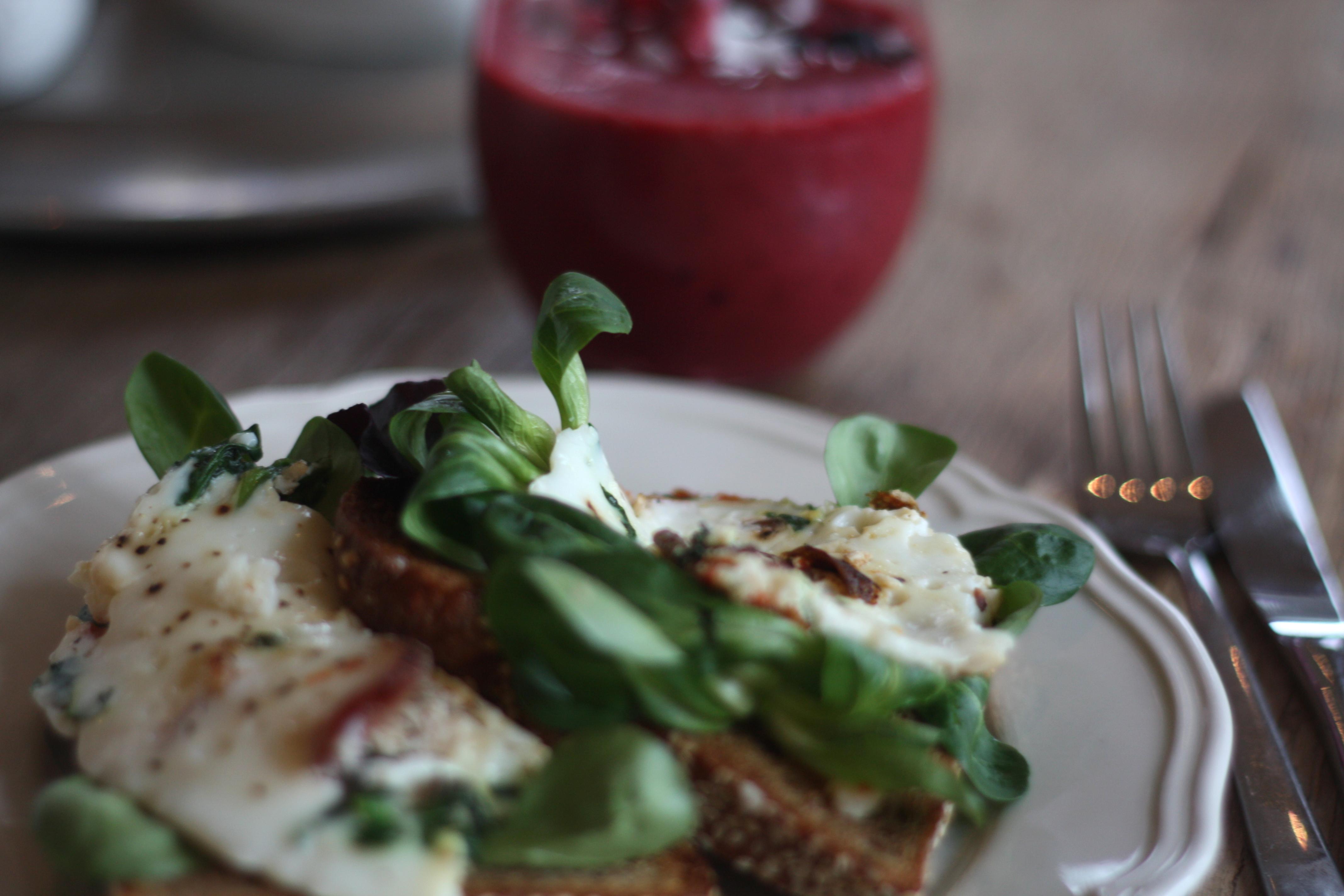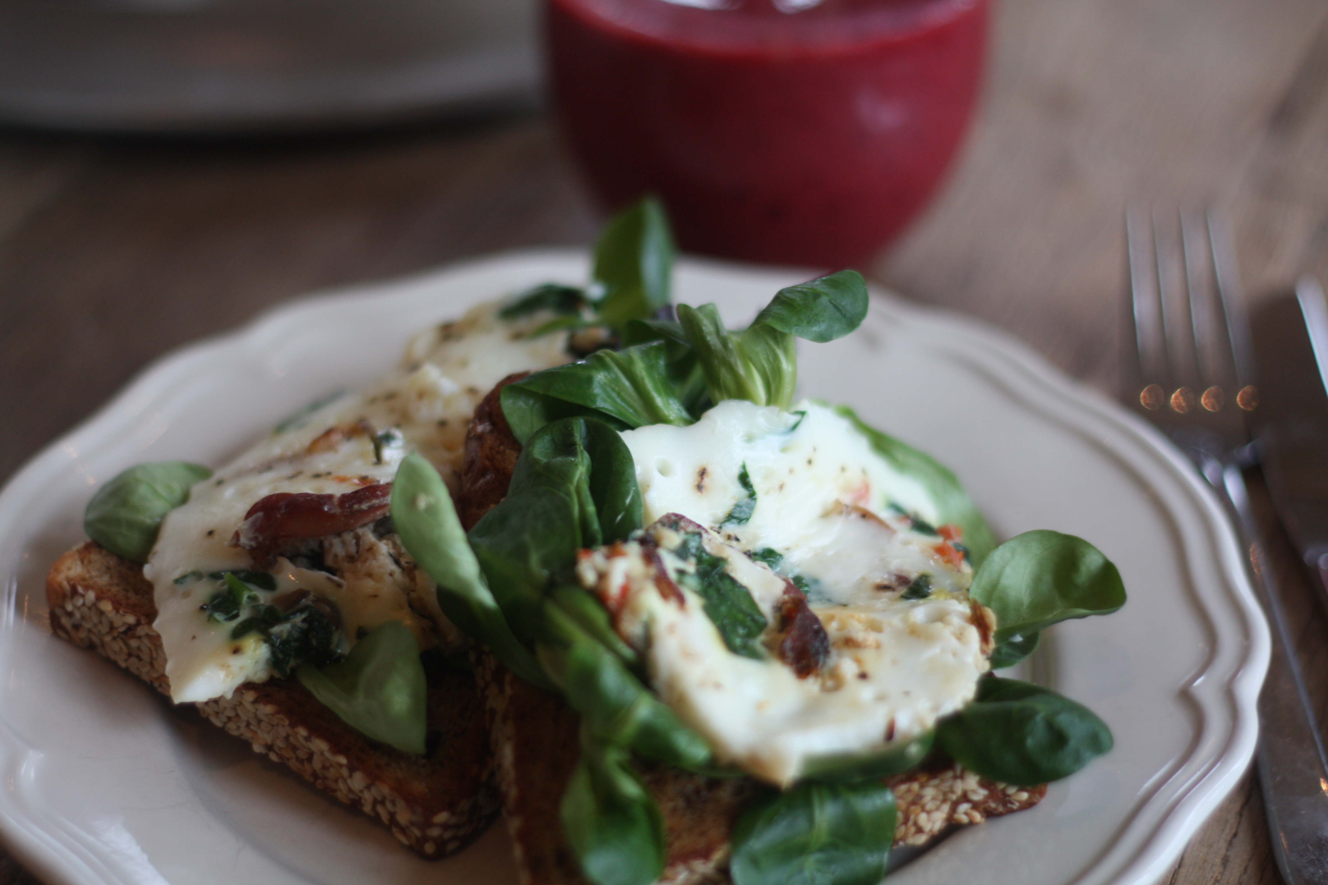 Jeg serverte omeletten på ristet lavkarbobrød med salat. Med en frisk skogsbær smoothie til. Har du en deilig og energigivende måltid.