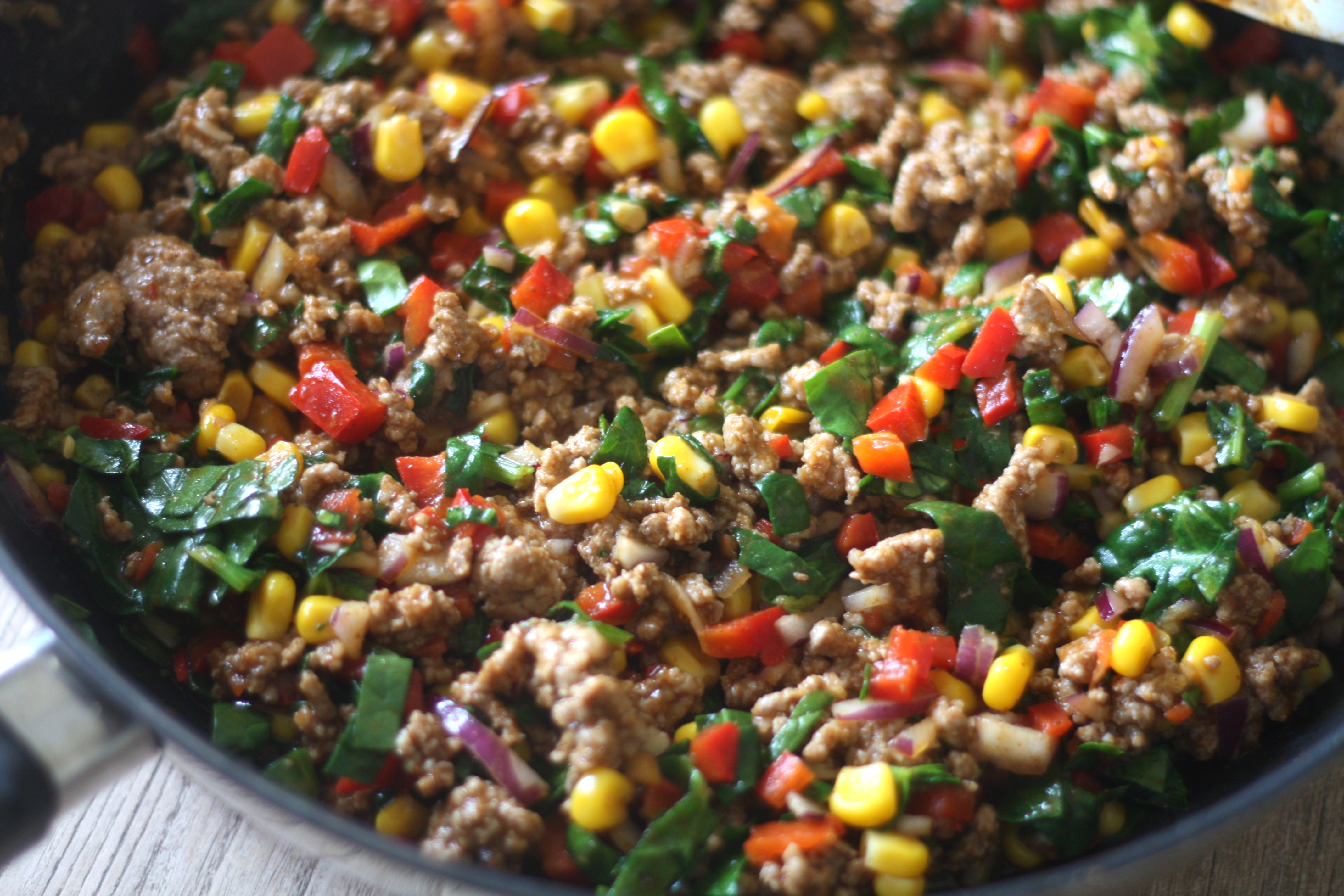 2. Stek kjøttdeigen og tilsett tacokrydderet. Tilsett deretter grønnsakene og bland godt sammen. Fyllet må avkjøles før det skal i deigen.