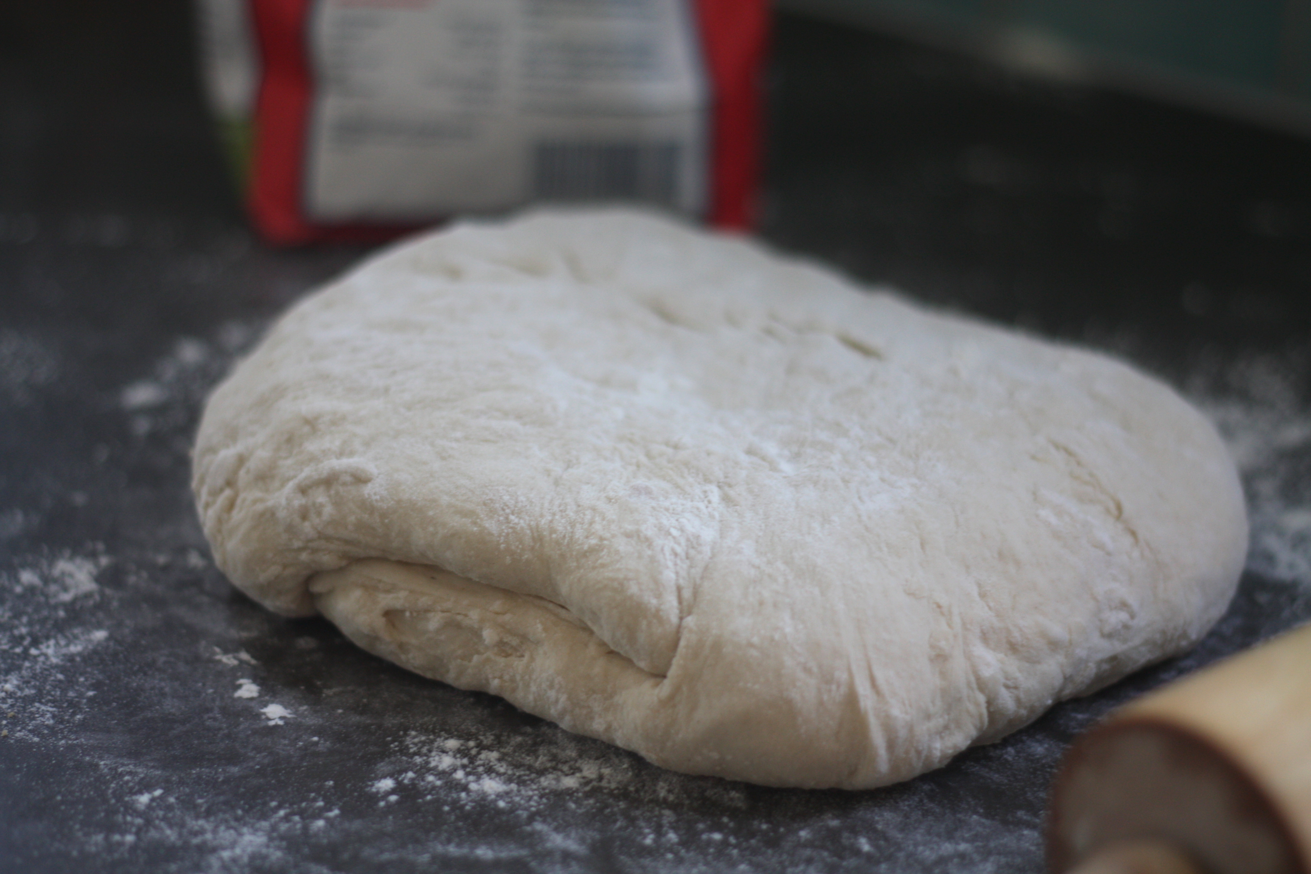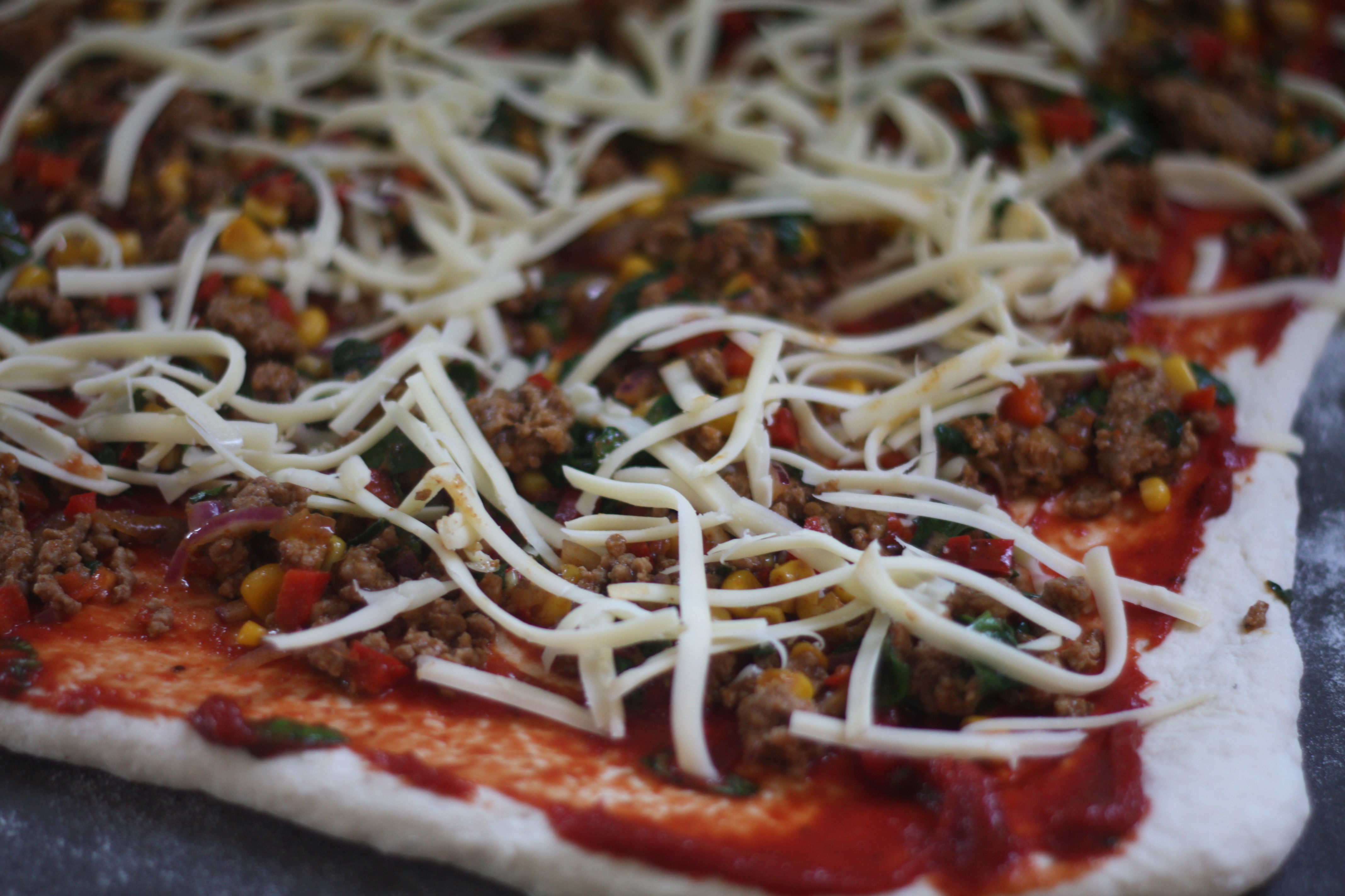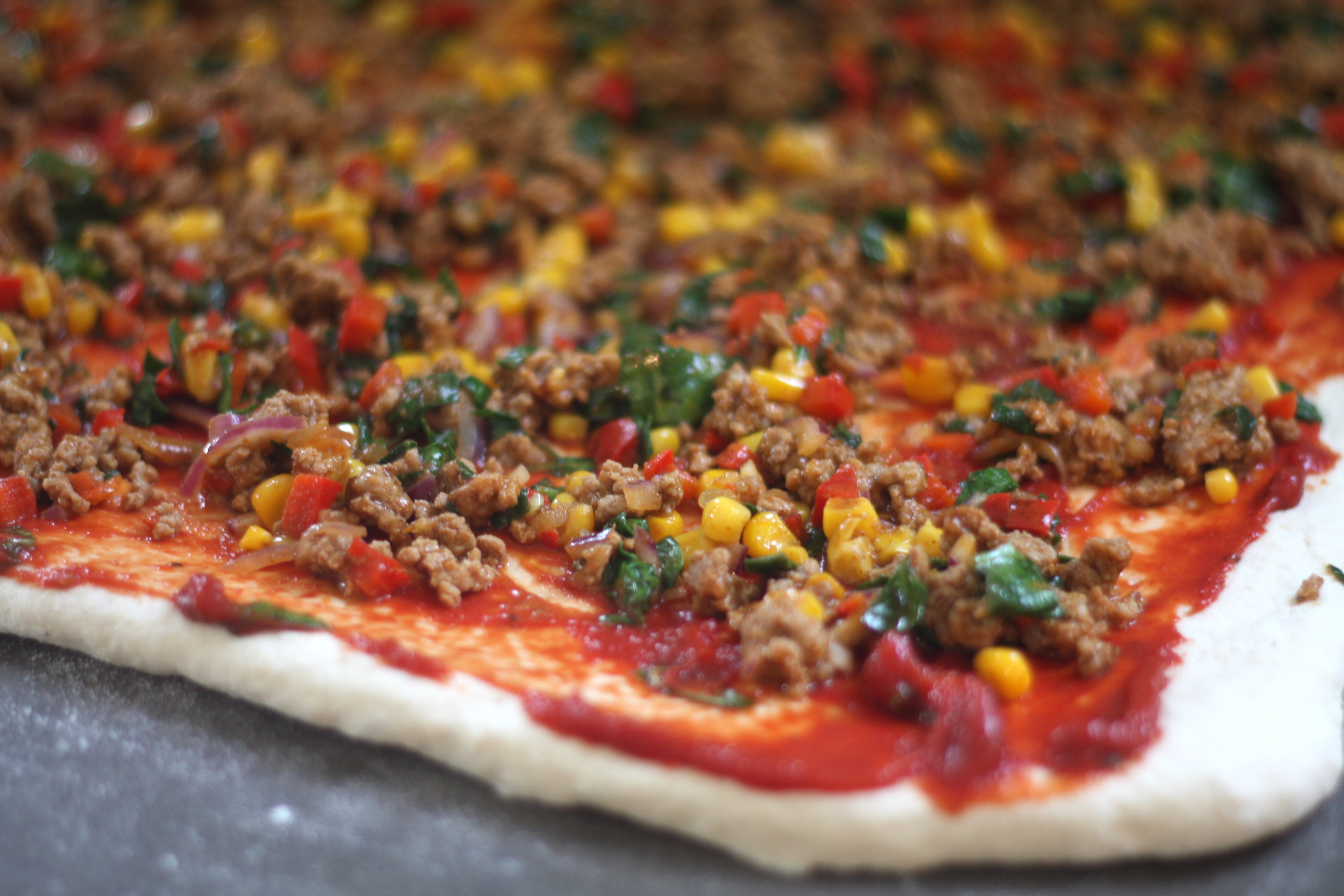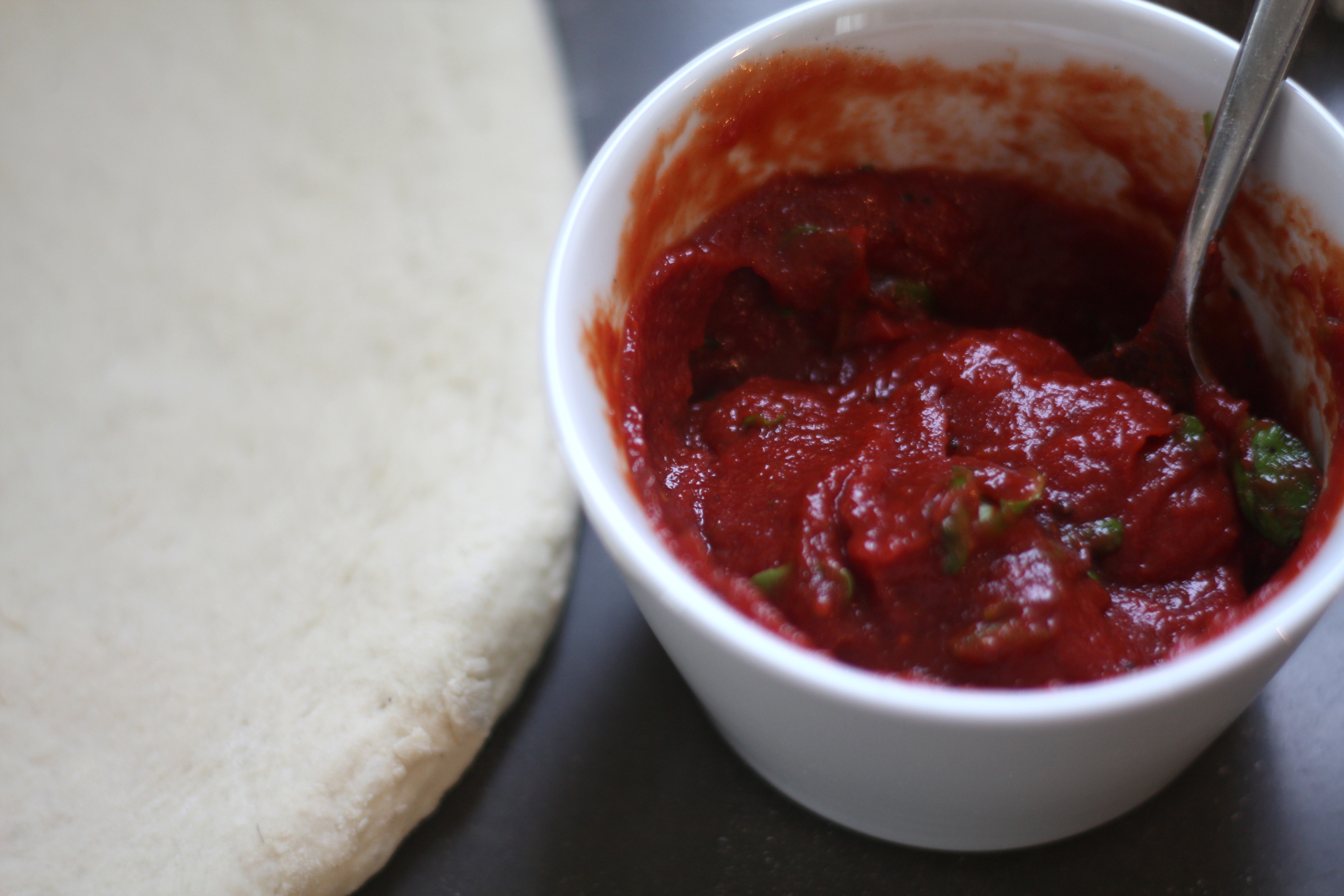 3. Kjevle ut deigen til 3-4 mm tykkelse.Jeg laget en rask tomatsaus til å smøre ut på bunnen. Bland sammen en liten boks tomatpure, sammen med ketchup, litt basilikum. Smak til med salt og pepper. Smør ut på bunnen.