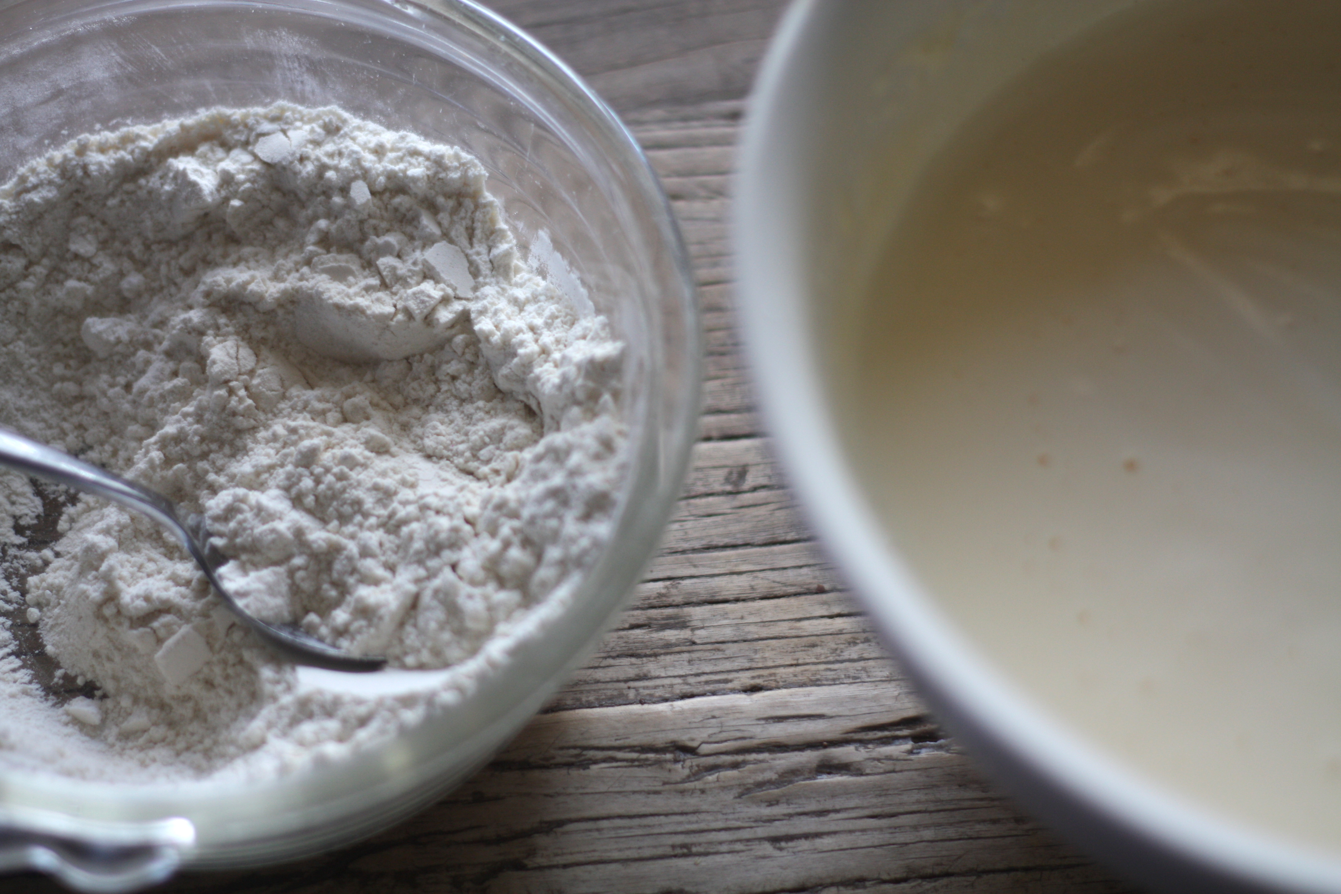 2. Sikt inn mel og bakepulver. Vend det forsiktig inn med en slikkepott. Rører du for hardt ødelegger du luftboblene.