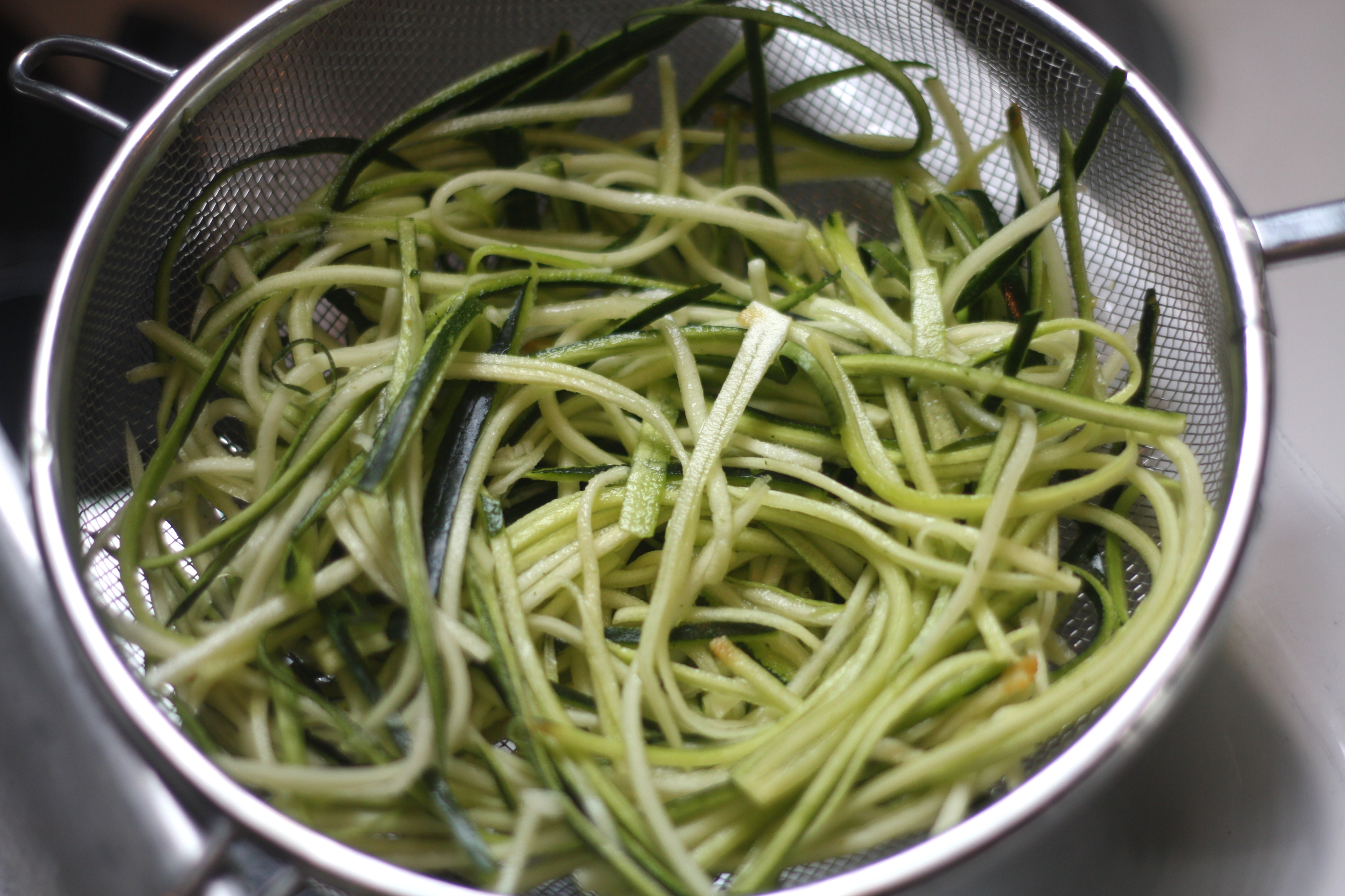1. Riv squashen med et julienne. Jeg kjøpte min for 129 kr på Jernia. Du kan også bruke en skreller. Riv til du kommer til frøene.