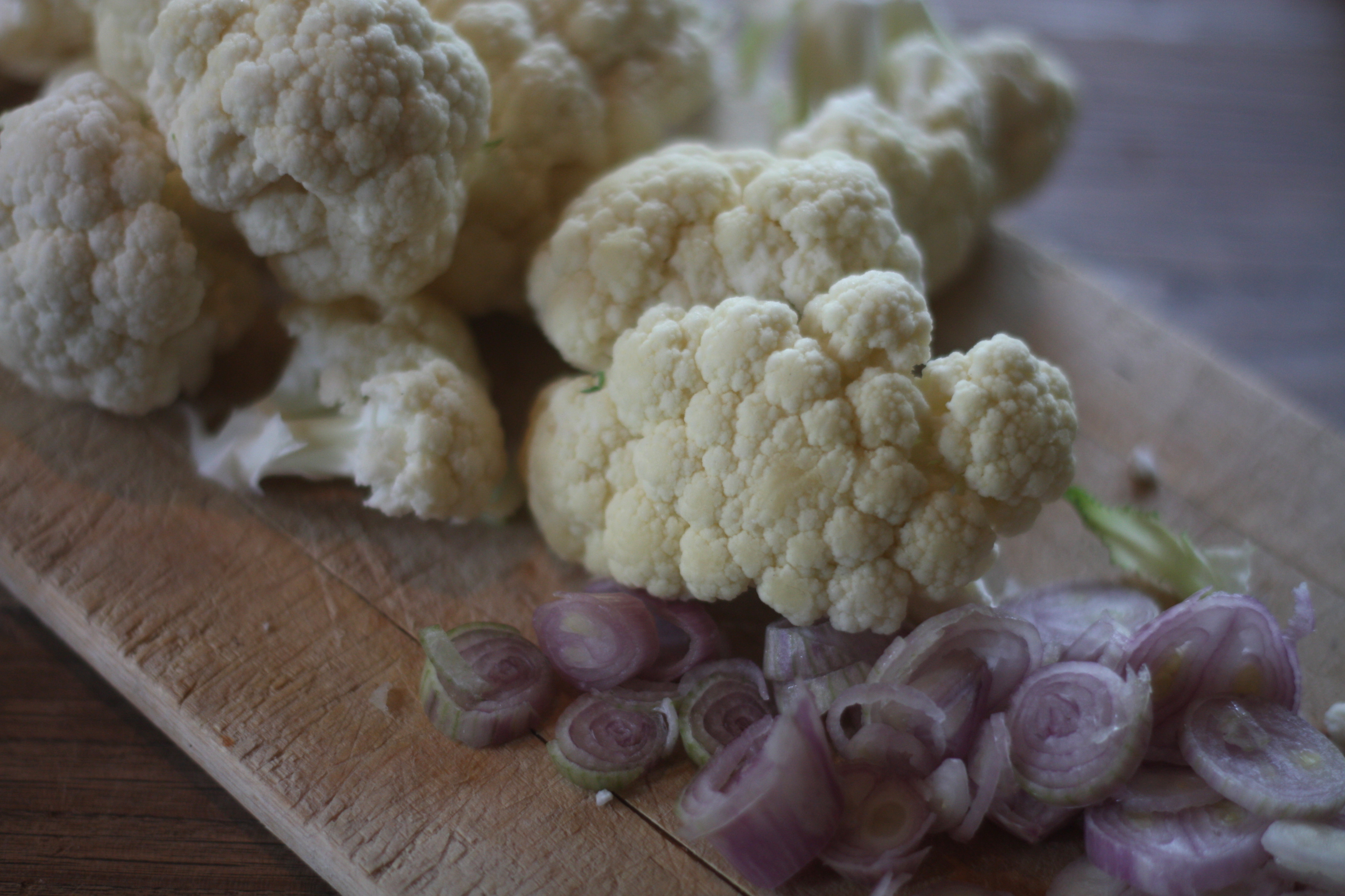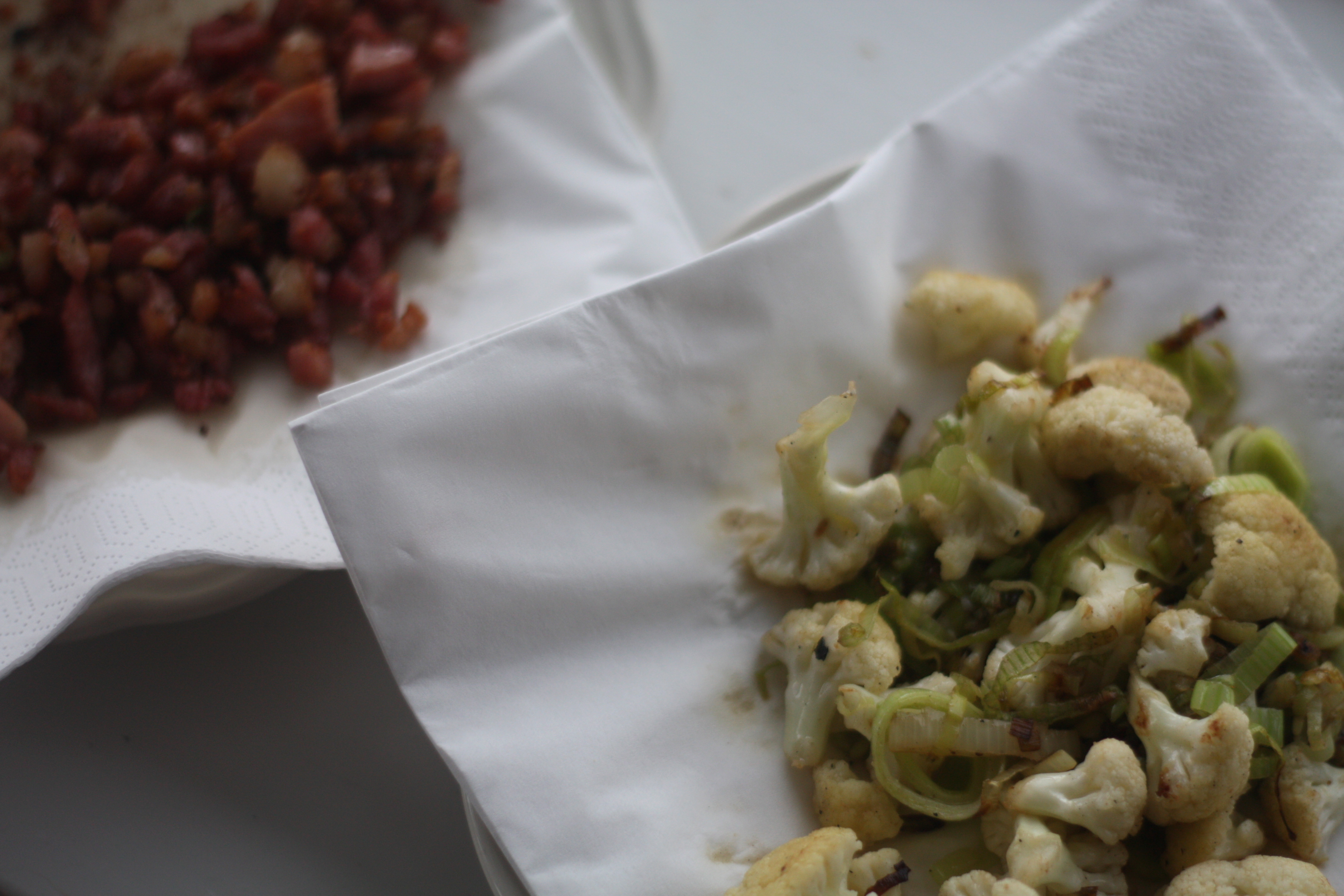 4. Stek baconet rett før servering. Jeg liker det best sprøstekt. Surr purreløken og et par blomkålbuketter i smør. Til de får litt farge. La det renne av på papir.