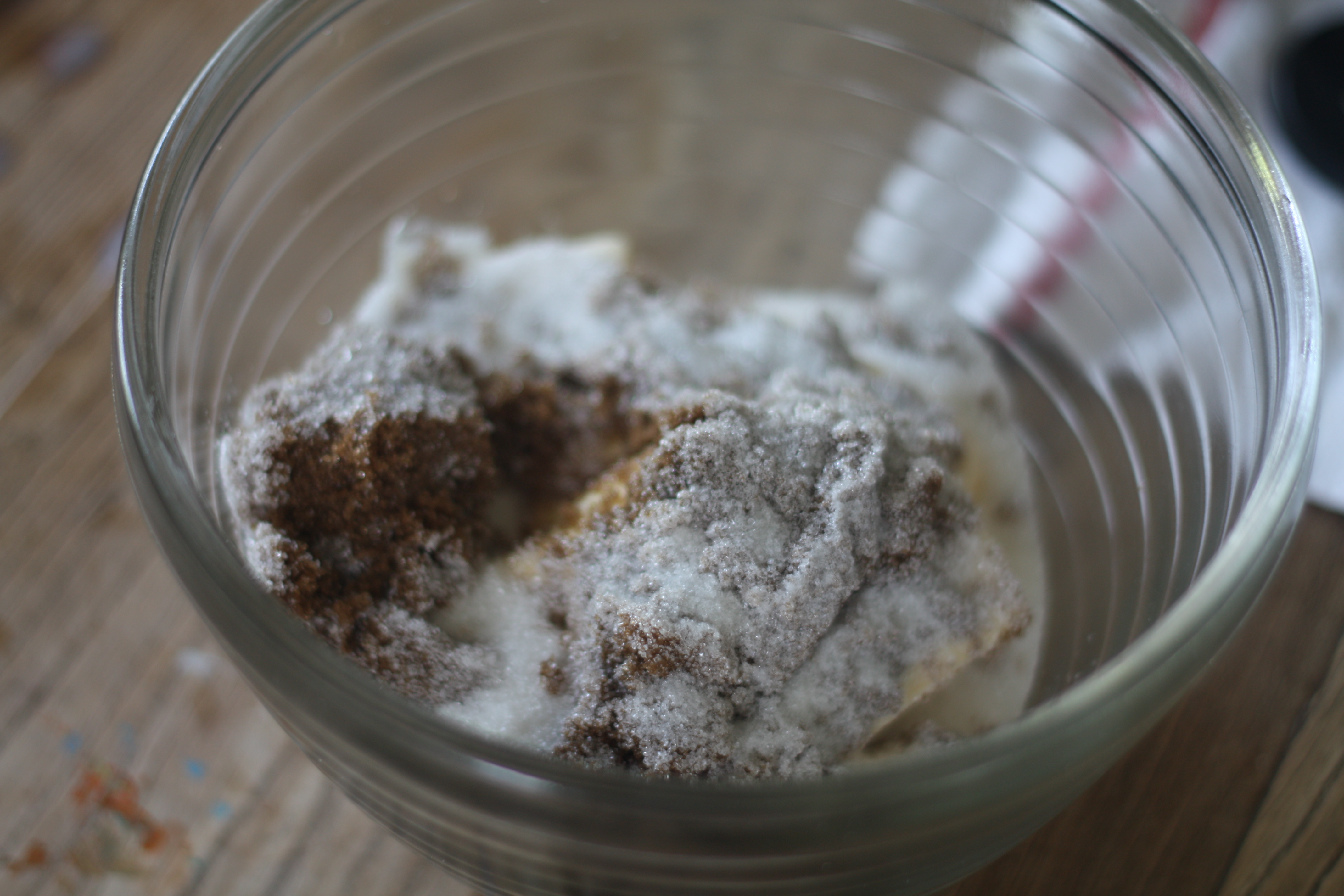 1. Bland smør og sukker godt sammen med en håndmikser.