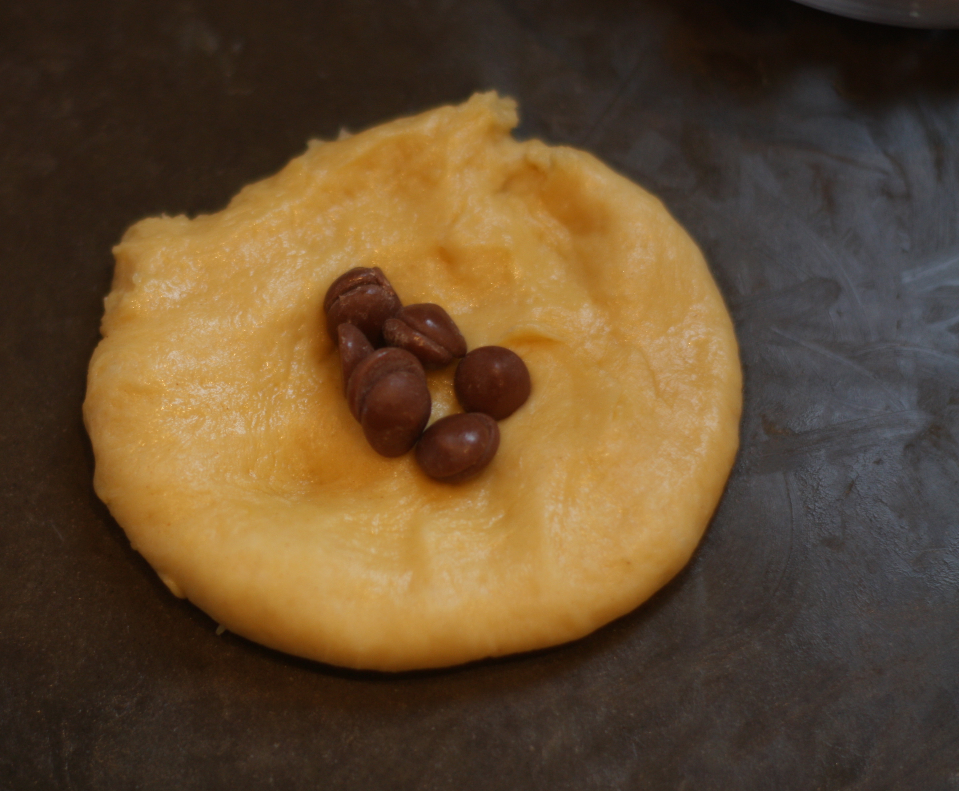 2. Trykk bollene flate og ha i sjokolade. Rull sammen som en bolle.